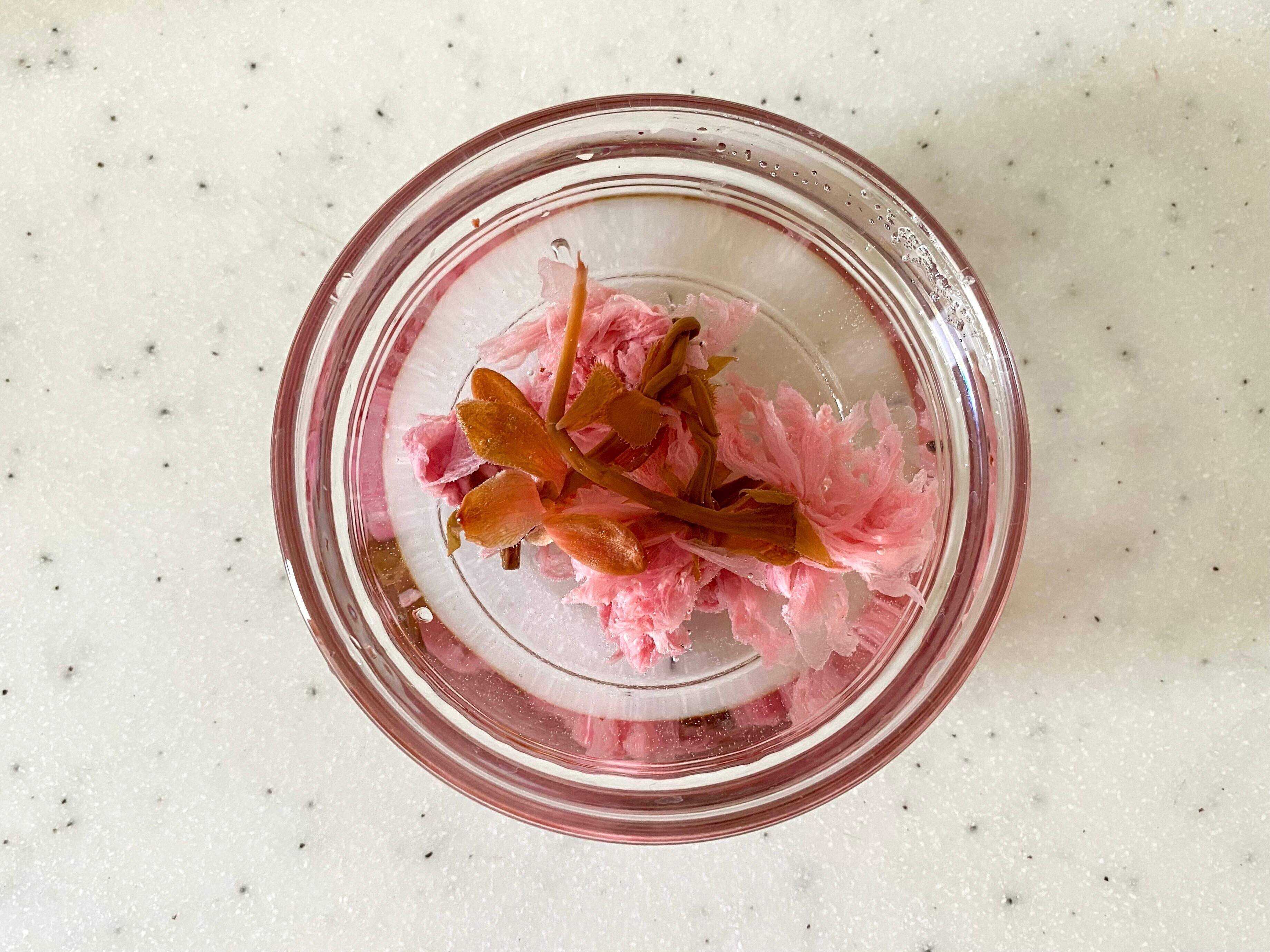 【1】 桜の塩漬けは10分ほど水に浸したあと、キッチンペーパーの上にのせて水気を切る。