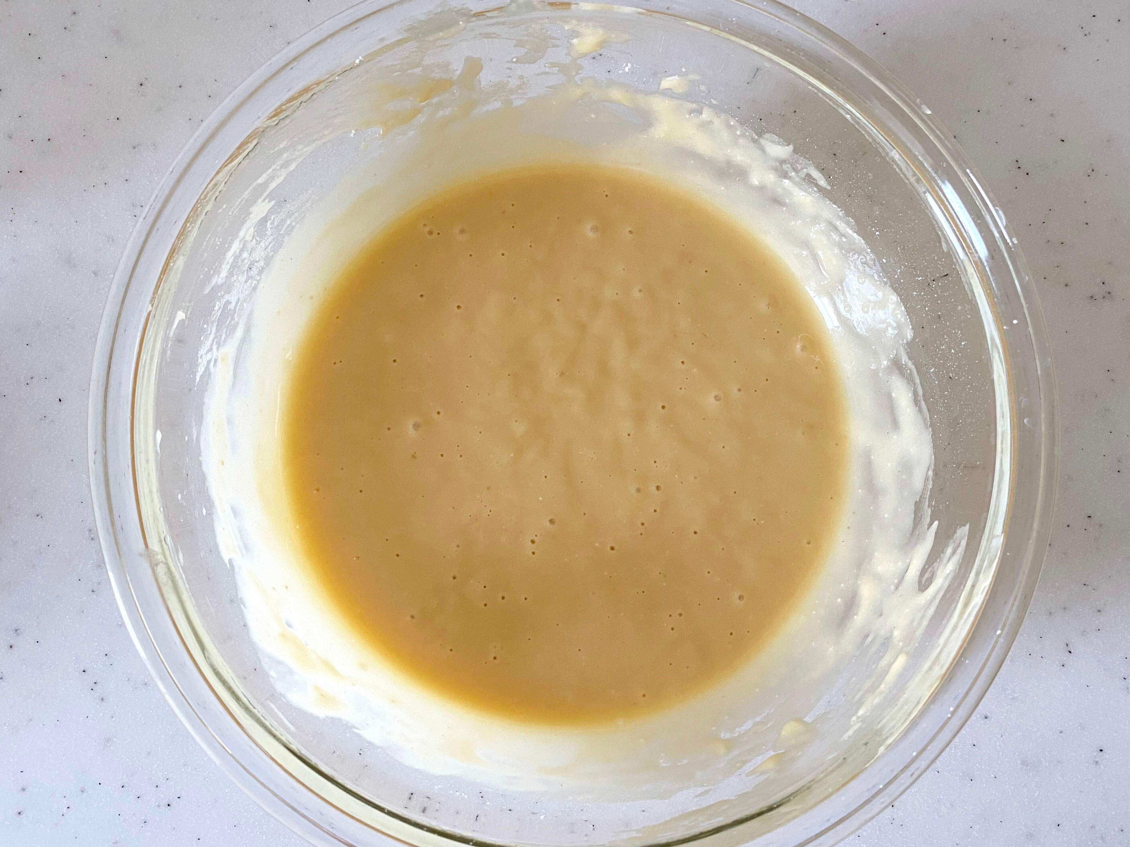 【2】 ボウルに卵を割りほぐし、牛乳と砂糖を加えてホイッパーでよく混ぜる。米油、ホットケーキミックスを加えて粉っぽさがなくなるまで混ぜる。