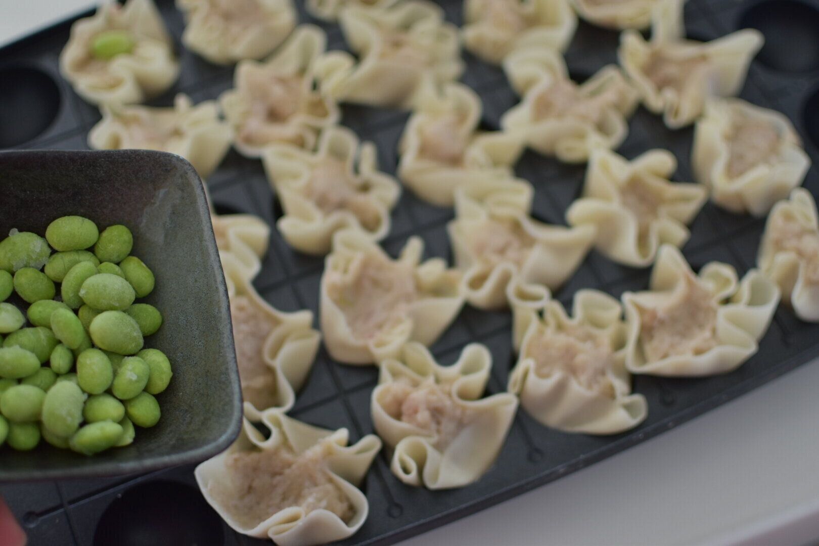 シュウマイの皮もしくは、餃子の皮に餡を乗せて包んでいきます。