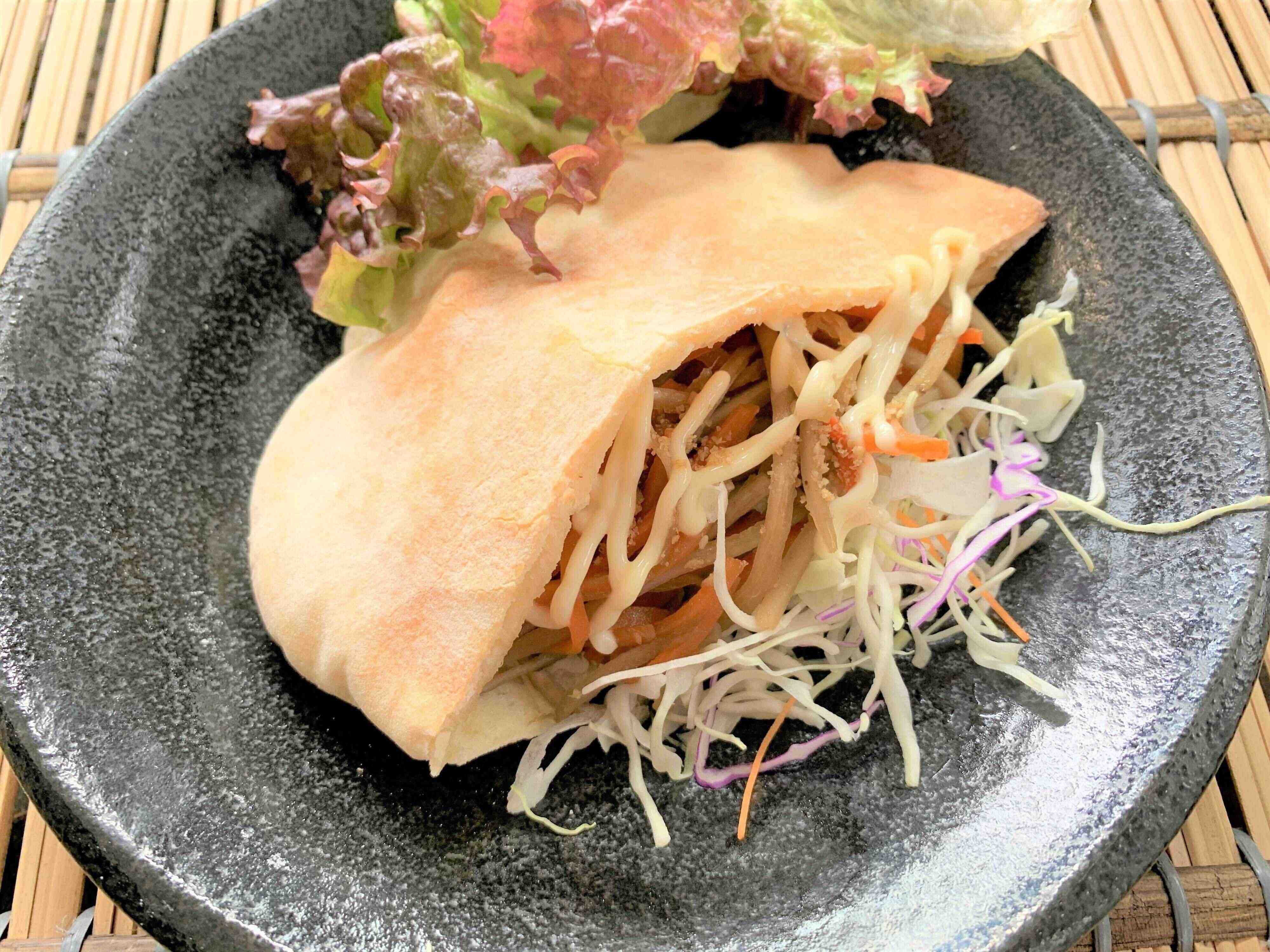 食べすぎが気になるときは、ピタパンを1/4サイズにカットして、三角のような形にしてもよいですよ。