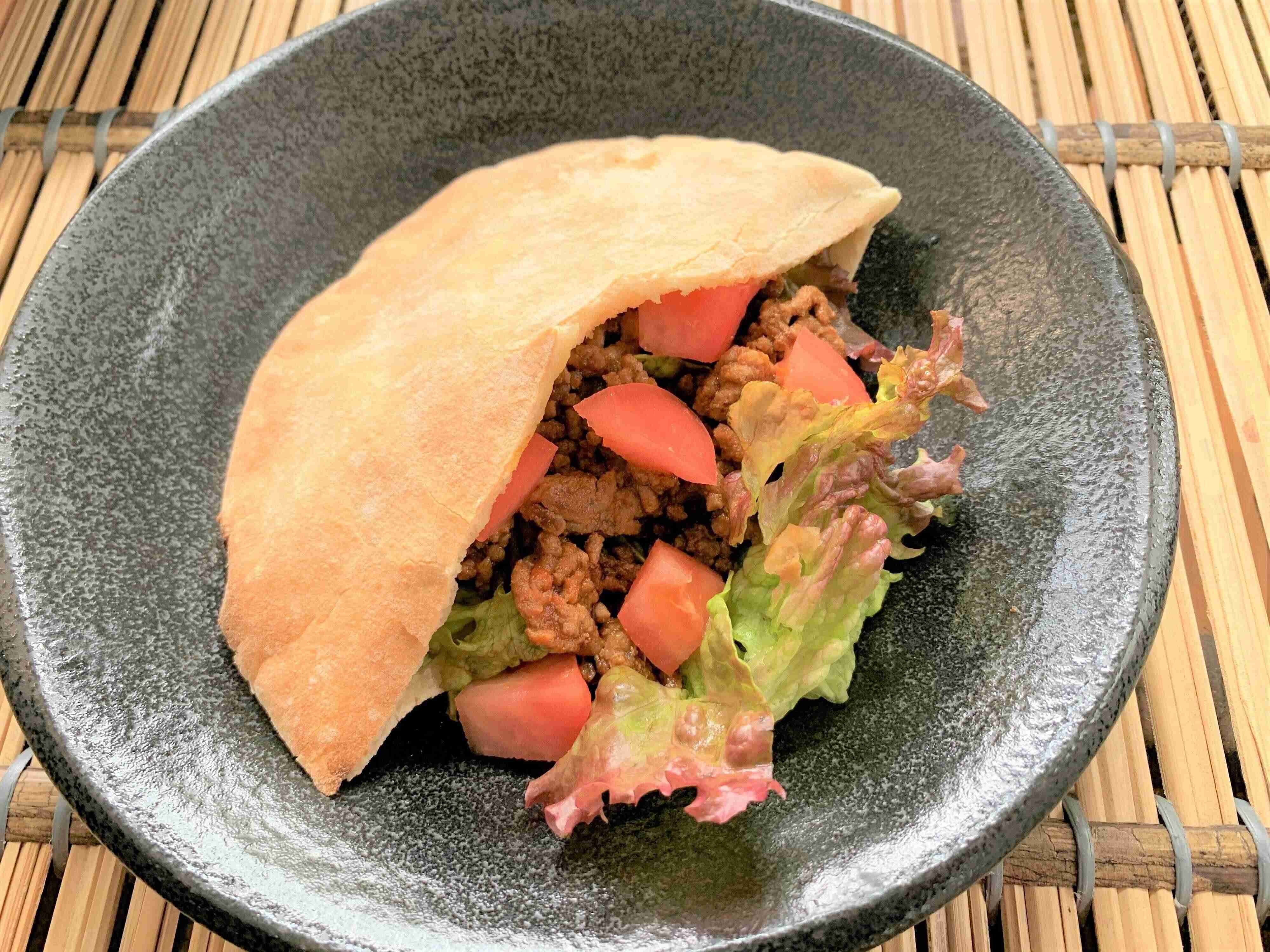 タコスミートとレタスやトマトなどでつくるタコス風。スパイシーな味わいがピパンとも相性がよく、おいしいです。ダイス状に切ったチーズを入れてもよい感じです。