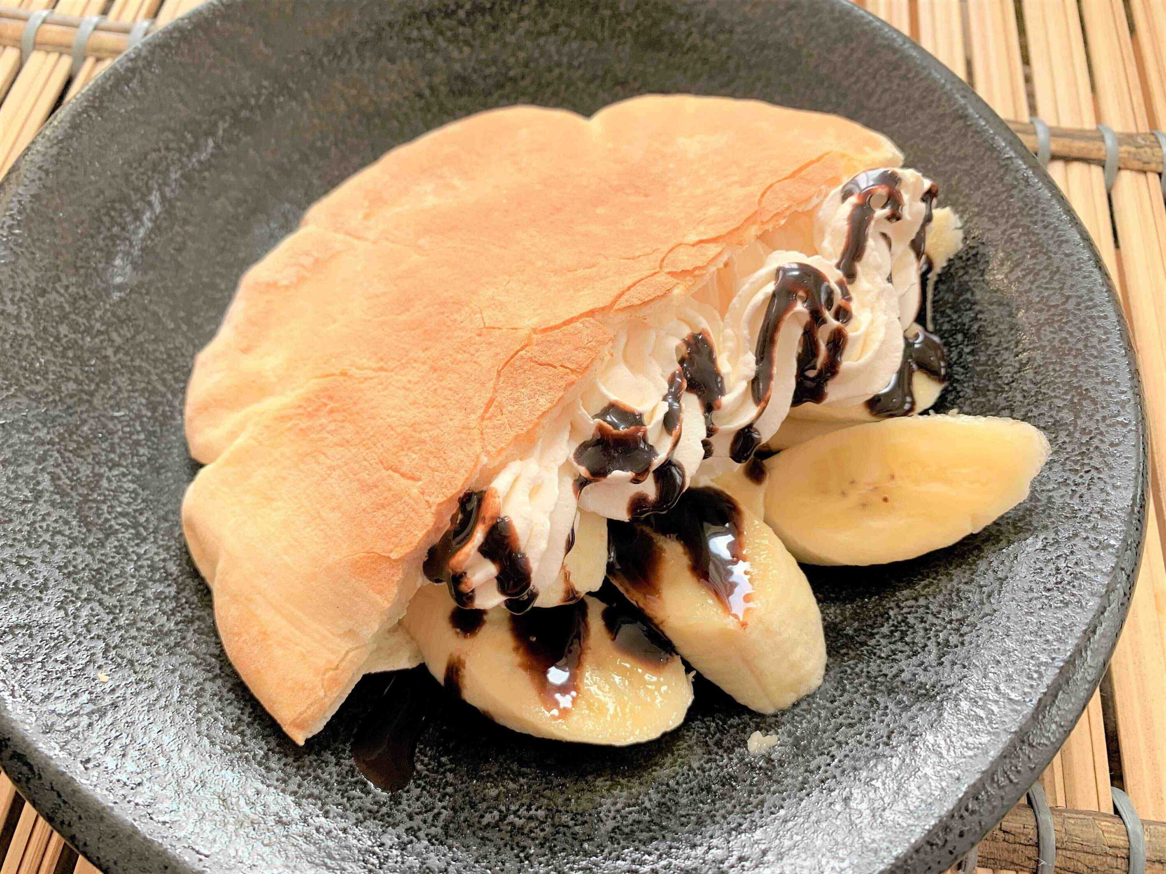 これもハマるおいしさ。スライスしたバナナにホイップクリームを絞って、チョコソースをかけるだけ。ピタパンの塩気とバナナチョコクリームの甘さが絶妙すぎるおいしさです。