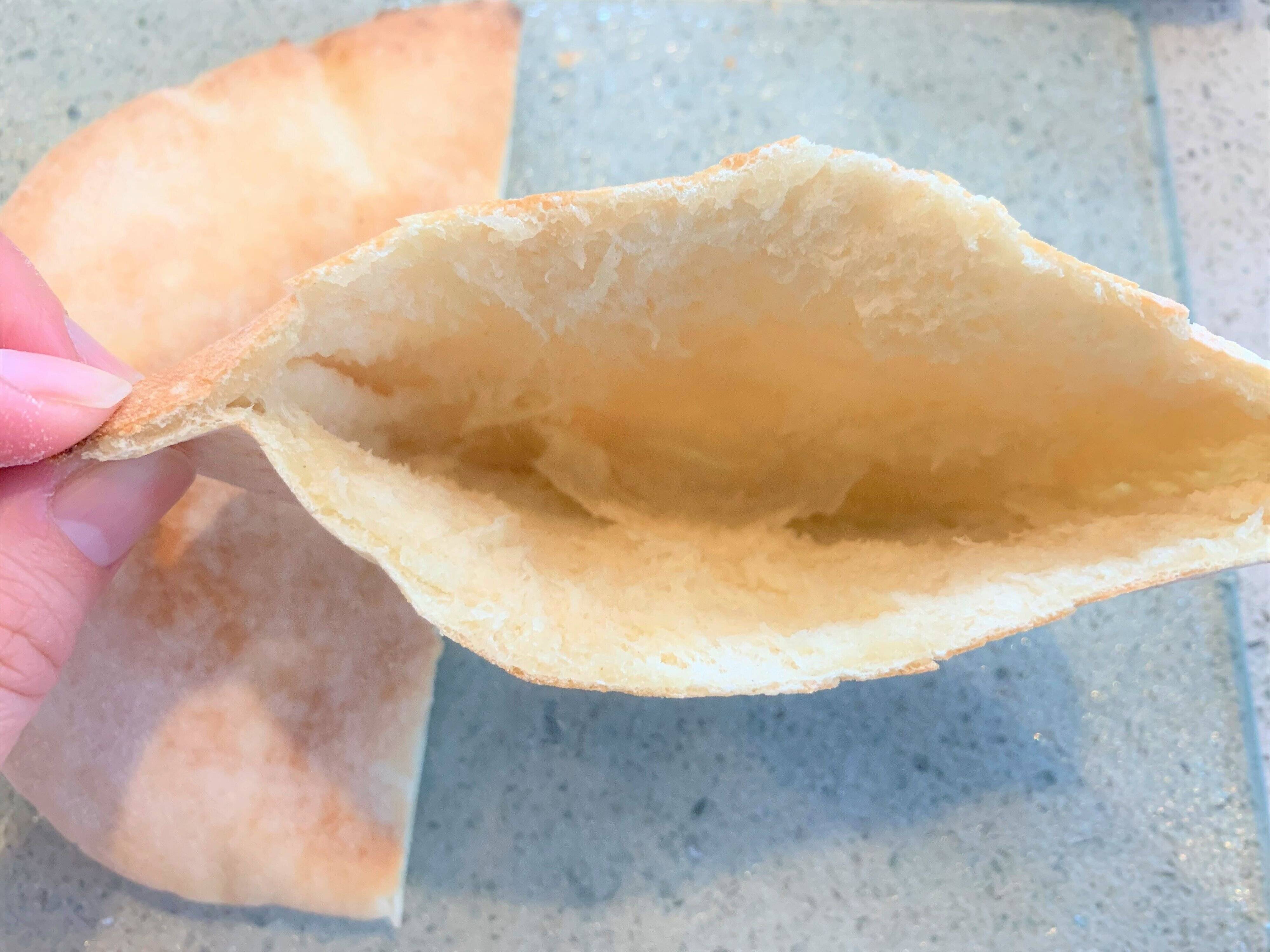 焼いたピタパンを半分にカットすると、ポケット状に開くことができます。