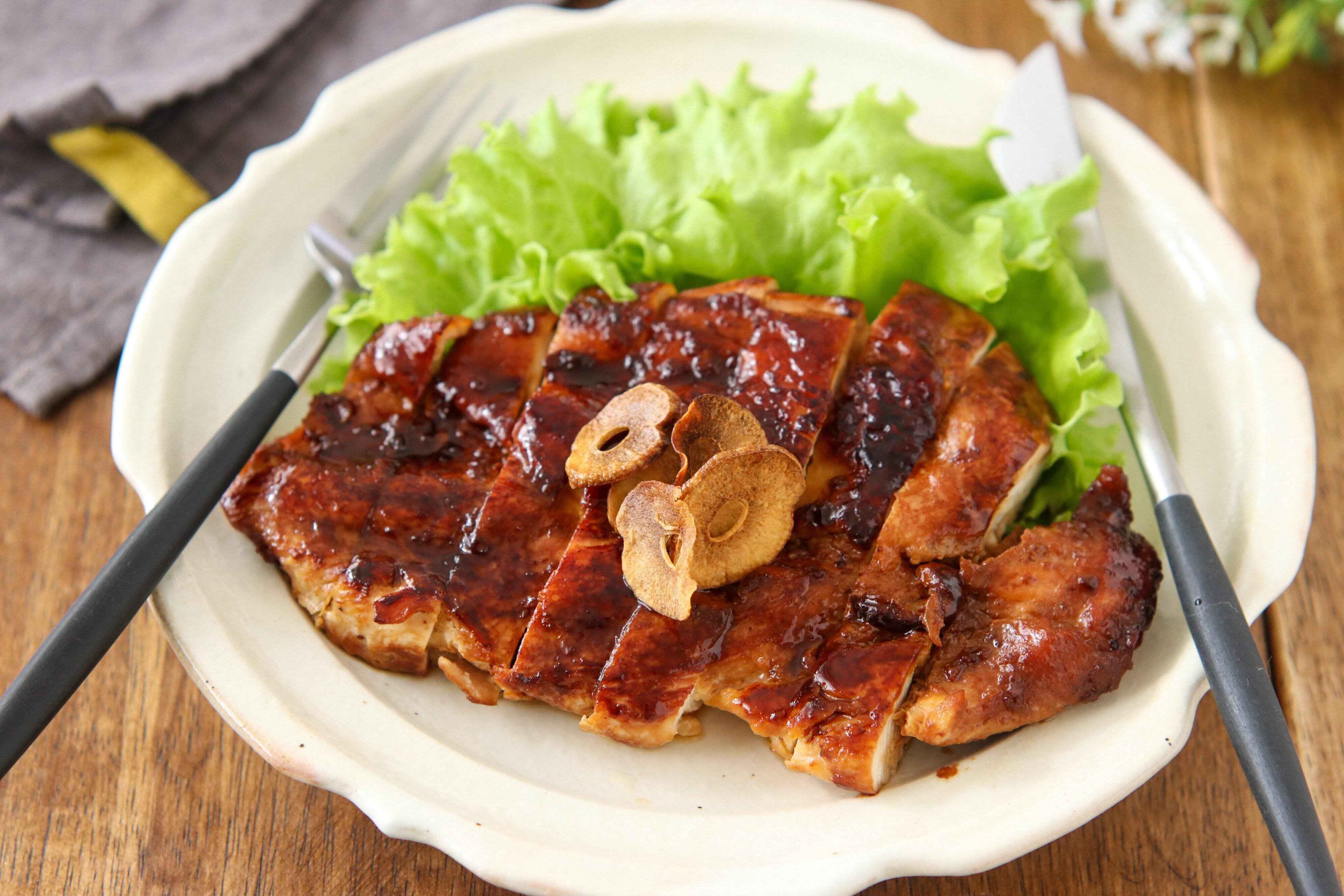 また、ガーリックチップを添える際は、鶏肉を焼く前にサラダ油で薄切りにんにくを焼き上げします。その油で鶏肉を焼くことで、一段と香り高く仕上がります。