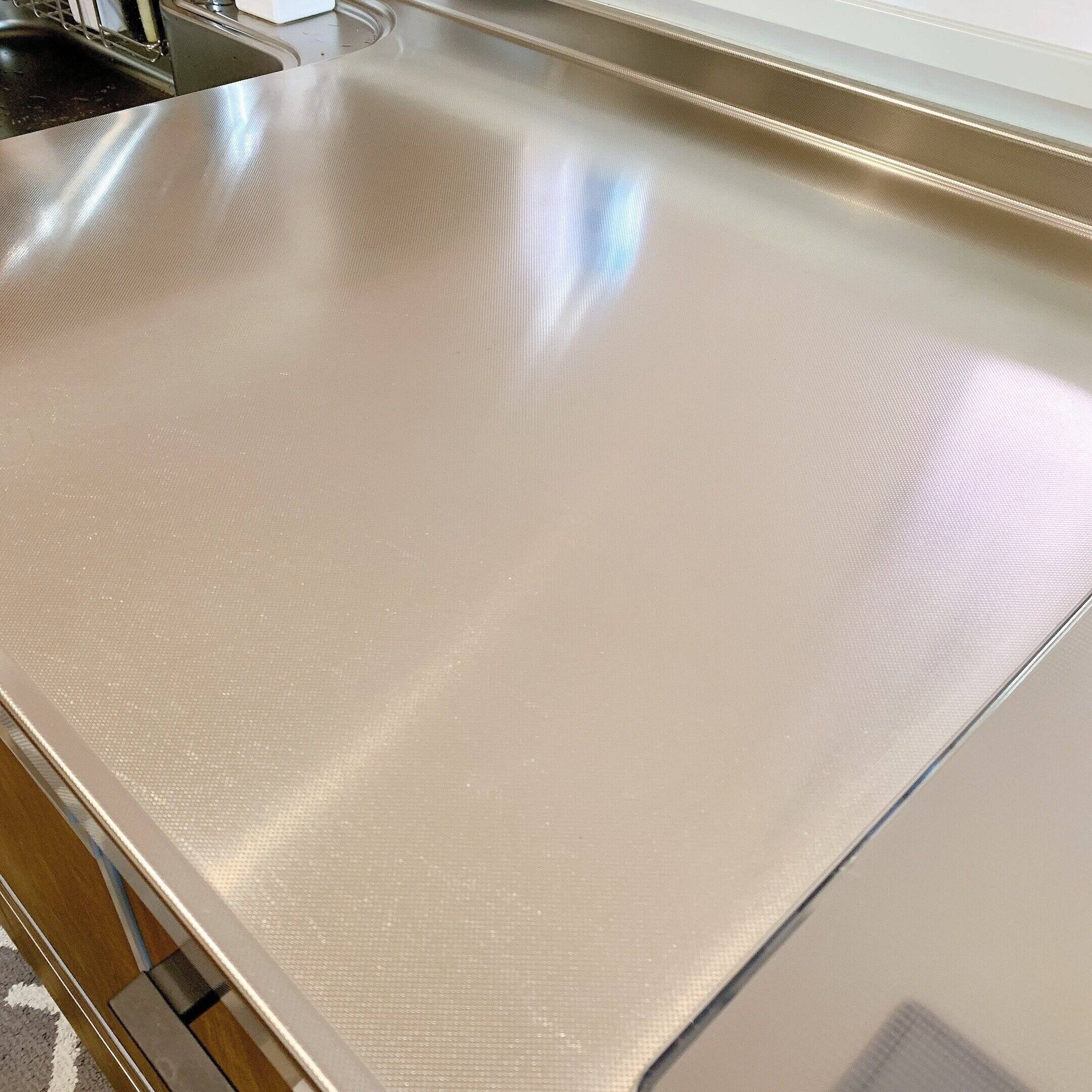 我が家のキッチンはエンボス加工されていて、ボコボコしているので傷が付きにくいのですが、でこぼこしている隙間に汚れが入りやすく、掃除もしにくいのです。