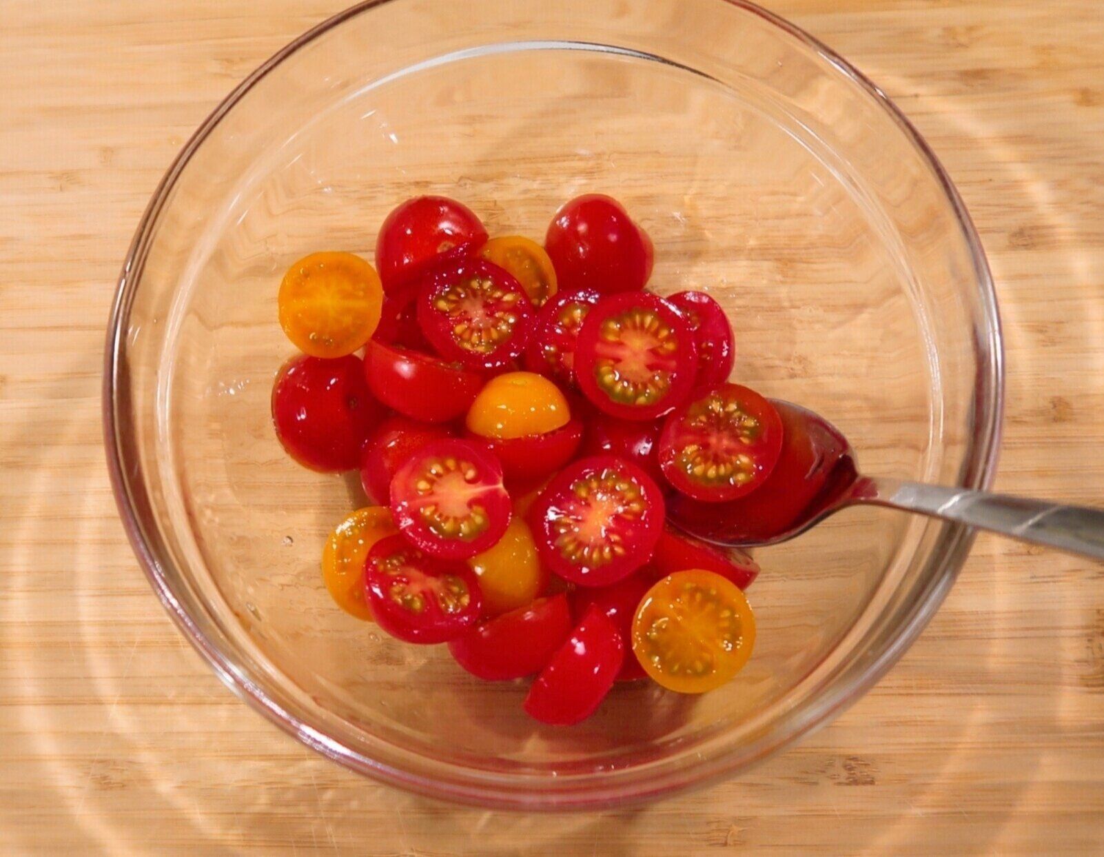 お好みの器に盛りつければ、ミニトマトの瞬間マリネの完成です!はちみつレモンのさわやかな風味が口いっぱいに広がります。