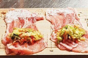 中学生の長女からの「ご飯少なめ、野菜多め」のリクエストに応えて。肉巻きは、薄切り肉を2枚重ねて、塩もみした野菜を巻き、巻き終わりを片栗粉で留めて焼きます。