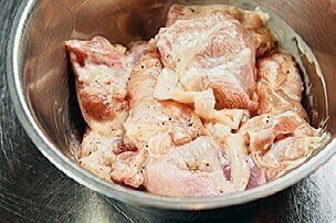 (1)鶏肉を下味の材料に漬け込み、15分以上おく(できれば一晩漬け込むとよい)。