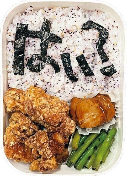 彩りを気にする気分じゃないので、買ってきたから揚げを詰めただけ。味つきご飯にしたから、いいっしょ?(笑)