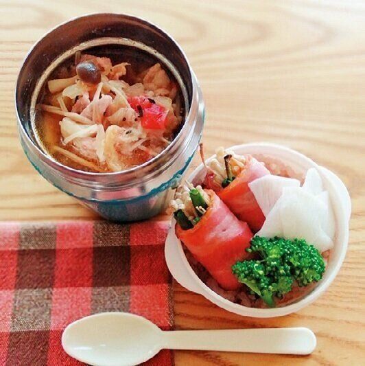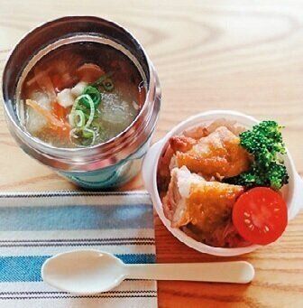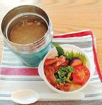 スープ+ミニおかず(ご飯はおかずの下)が定番。おかずは作り置きや「おうち冷食」を活用します。気温が上がってきたら、ジャーに冷たい麺やフルーツとヨーグルトを入れられるので、夏も活躍していますよ。
