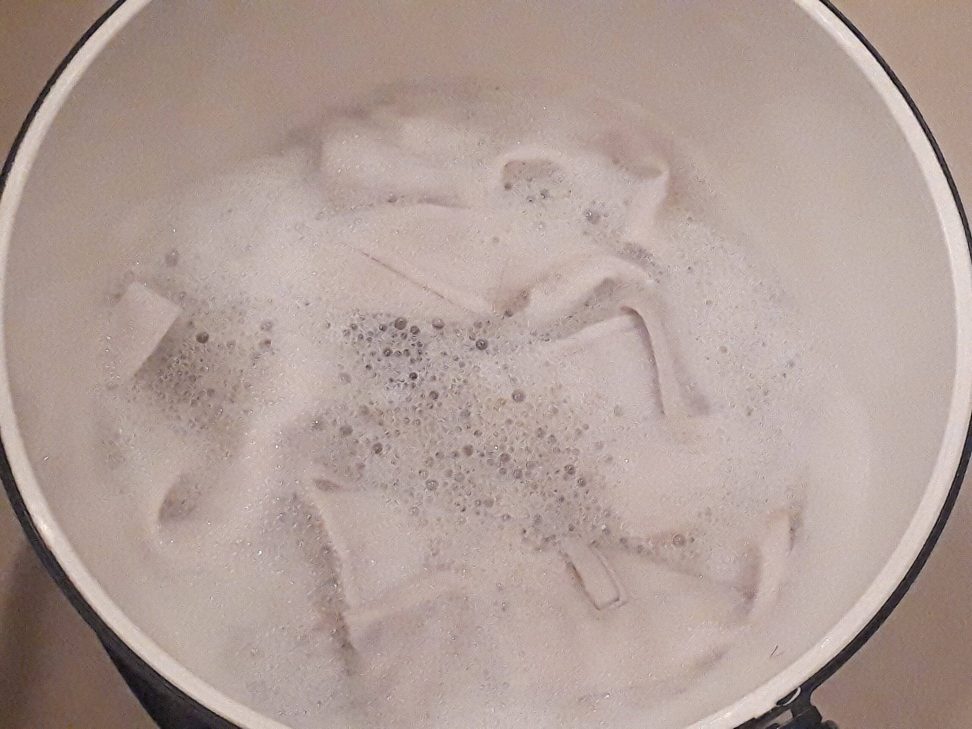 バケツウォッシャーのバケツに40℃~50℃のお湯を入れて泥汚れに強い洗剤または石鹸を溶かし、汚れたユニフォームやソックスを入れます。こちらの写真は、ユニフォーム(ズボン)2枚と白ソックス2足が入っています。