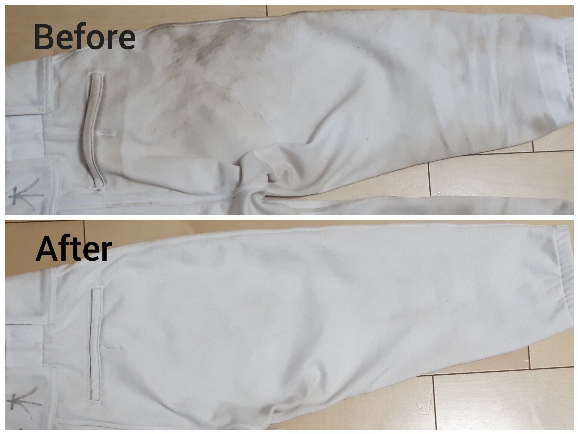 こちらの写真は、泥で汚れたユニフォームをバケツウォッシャーで予洗いした後に洗濯機で洗った場合のビフォーアフターです。以前は泥汚れに強い洗剤に1時間程度つけ置きした後にブラシでゴシゴシとこすり洗いしてから洗濯機で洗っていました。