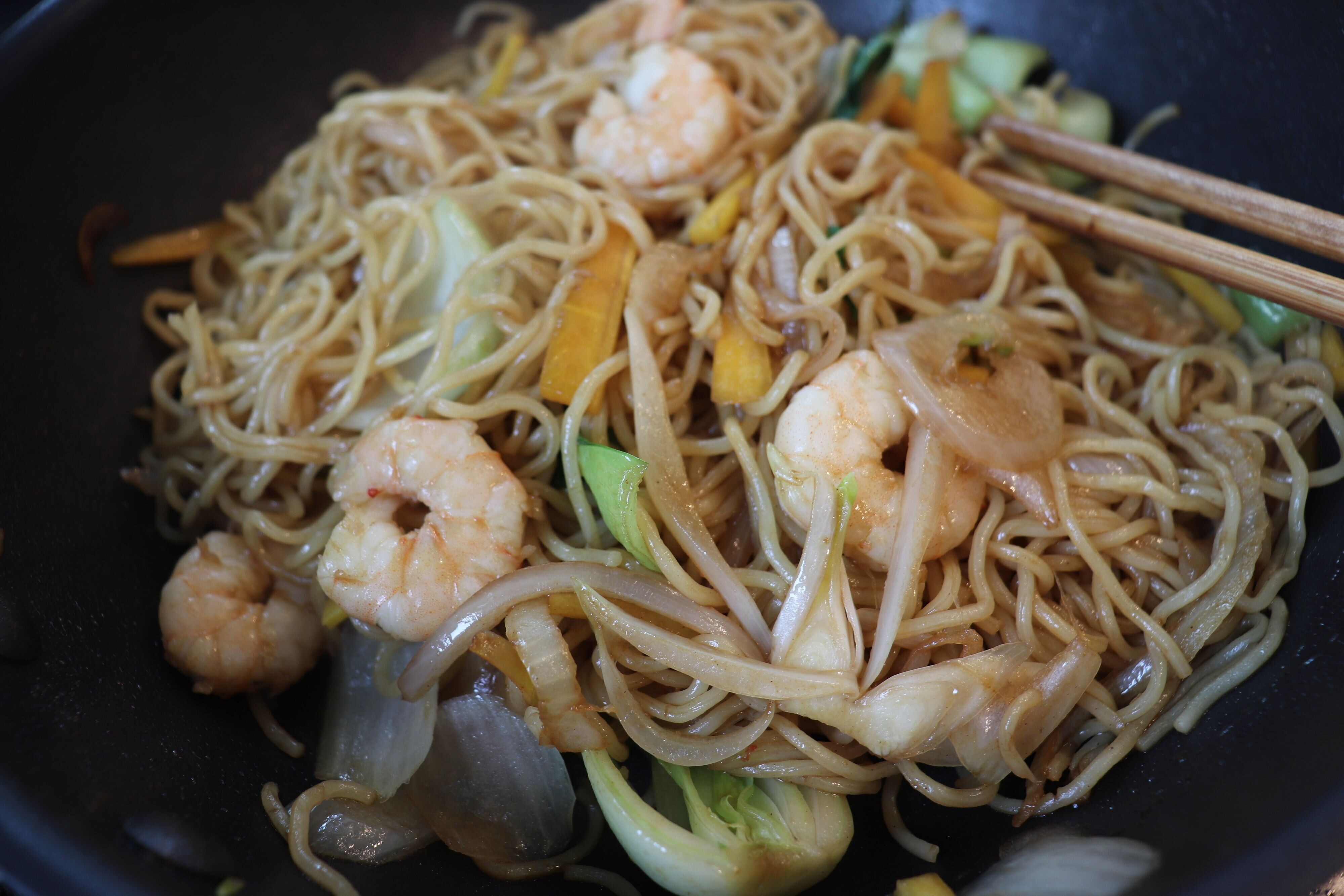 3.麺がほぐれて、肉や海老に火が通ったら、粉末ソースと、Aの調味料をすべて入れて混ぜる。