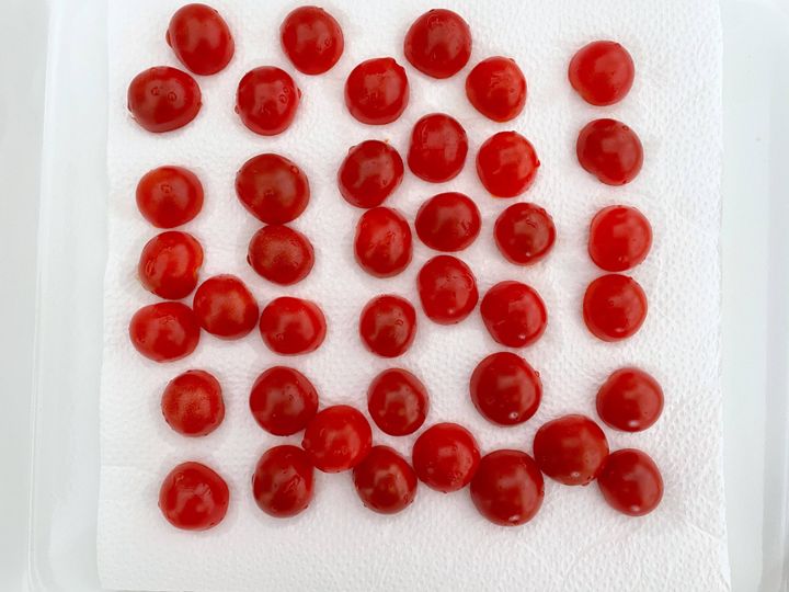 (1) ミニトマトは洗ってヘタを取り、半分にカットする。