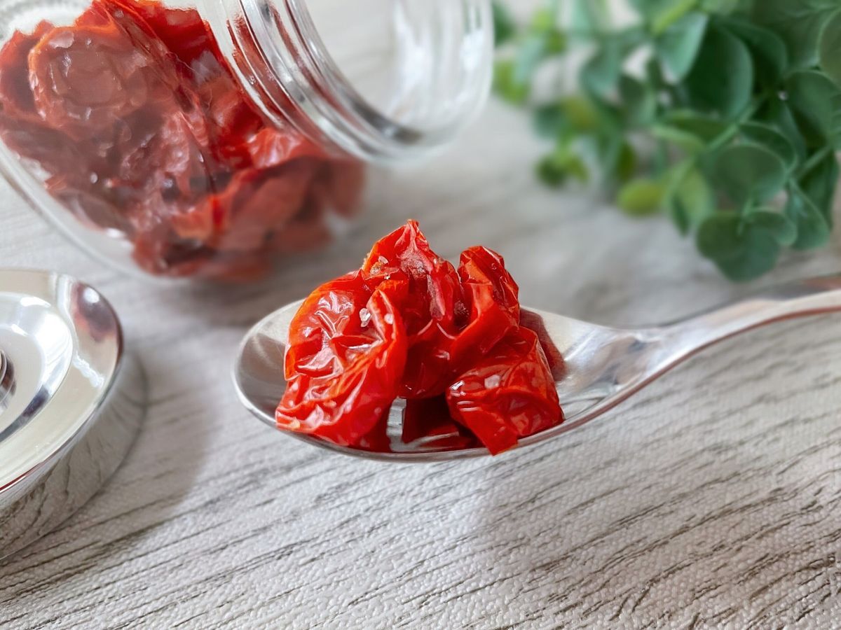 トマトは生で食べるのもおいしいですが、旨味がギュッと濃縮されたドライトマトは素材としてはもちろん、調味料としても使うことができる優れた食材です。水分が抜けているので、保存性も高まり傷みやすいトマトを長く楽しむこともできます。