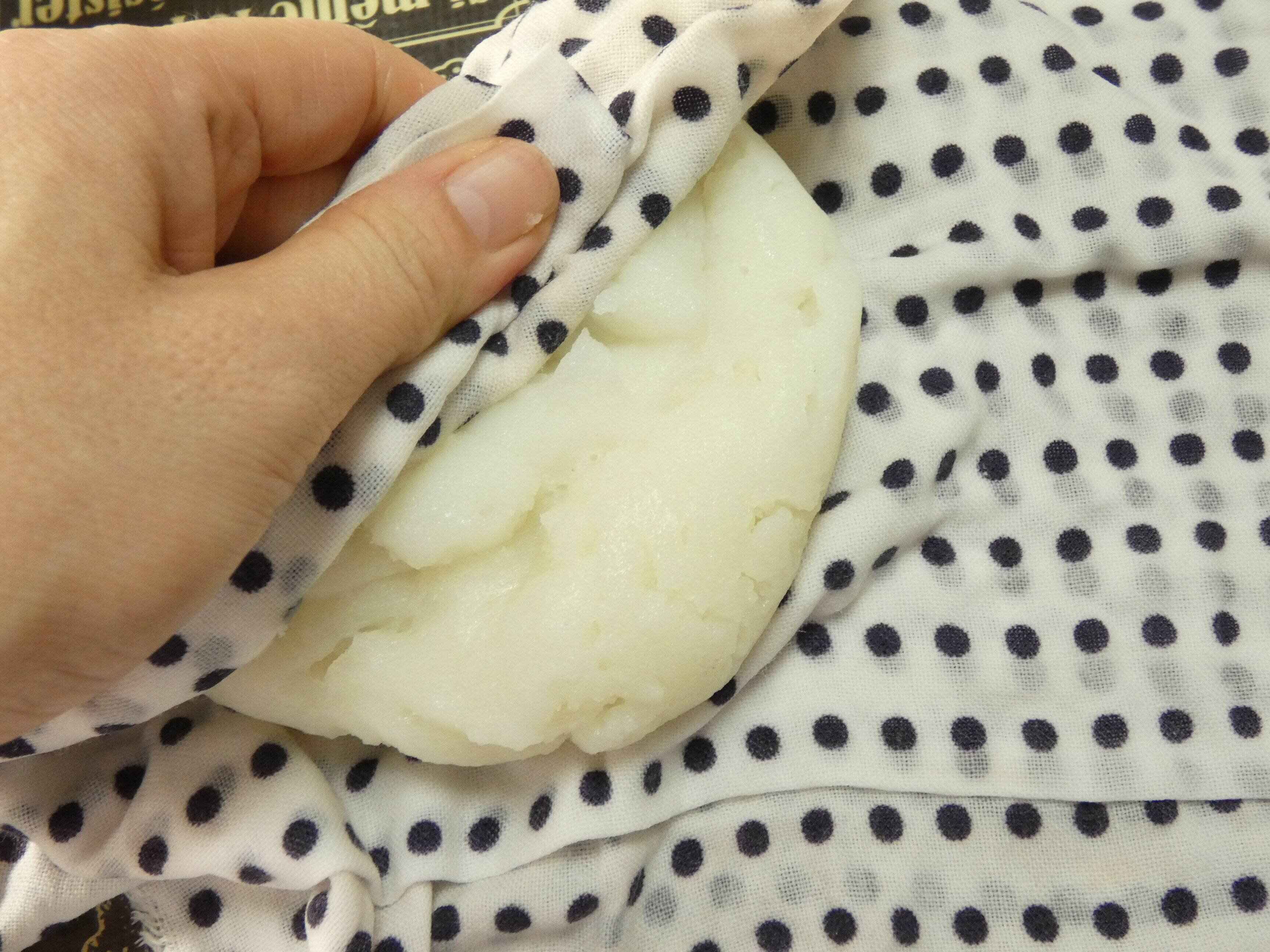 4.取り出してさらに良く混ぜたら、濡れ布巾で包んでなめらかになるまで折り畳むようにこねます。