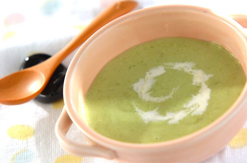 新玉ねぎ、グリーンピース、じゃがいものうま味が溶けこんだキレイな緑色のポタージュです。
