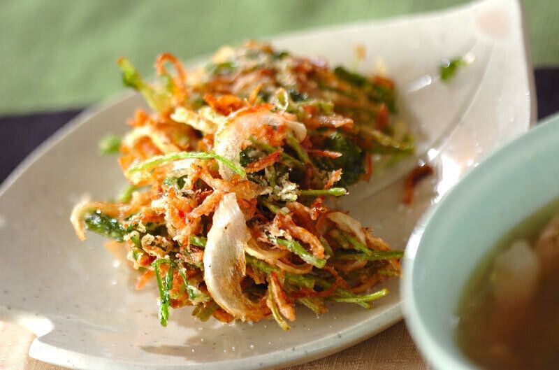 甘みたっぷりの新玉ねぎに香ばしい桜エビ、せりを合わせたかき揚げです。