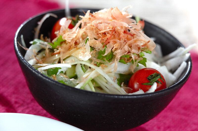 うすくスライスした新玉ねぎ、ミツバやきゅうり、トマトを使った和風のサラダ。