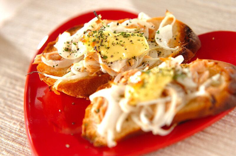 甘みのある新玉ねぎとツナフレークをバケットに乗せて焼き上げます。