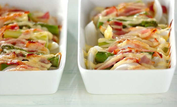 新玉ねぎとアスパラガス、ベーコンの組み合わせにマヨネーズをかけて焼くだけ。