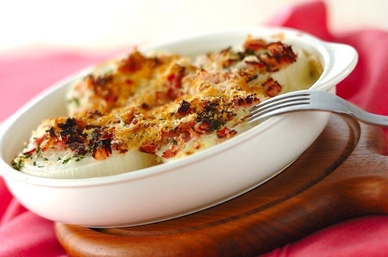 新玉ねぎとベーコンにたっぷりのベシャメルソースとパルメザンチーズを合わせてボリューム感もばっちり!