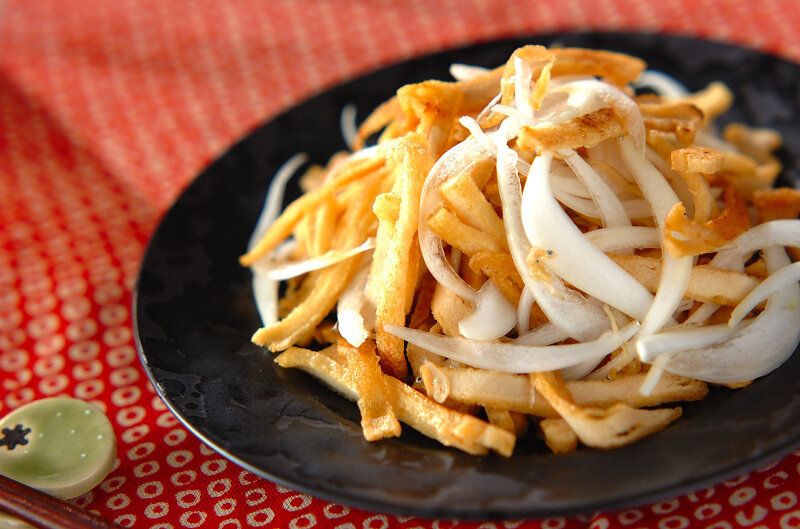 カリカリに炒めた油揚げとちりめんじゃことみずみずしい新玉ねぎの組み合わせ。