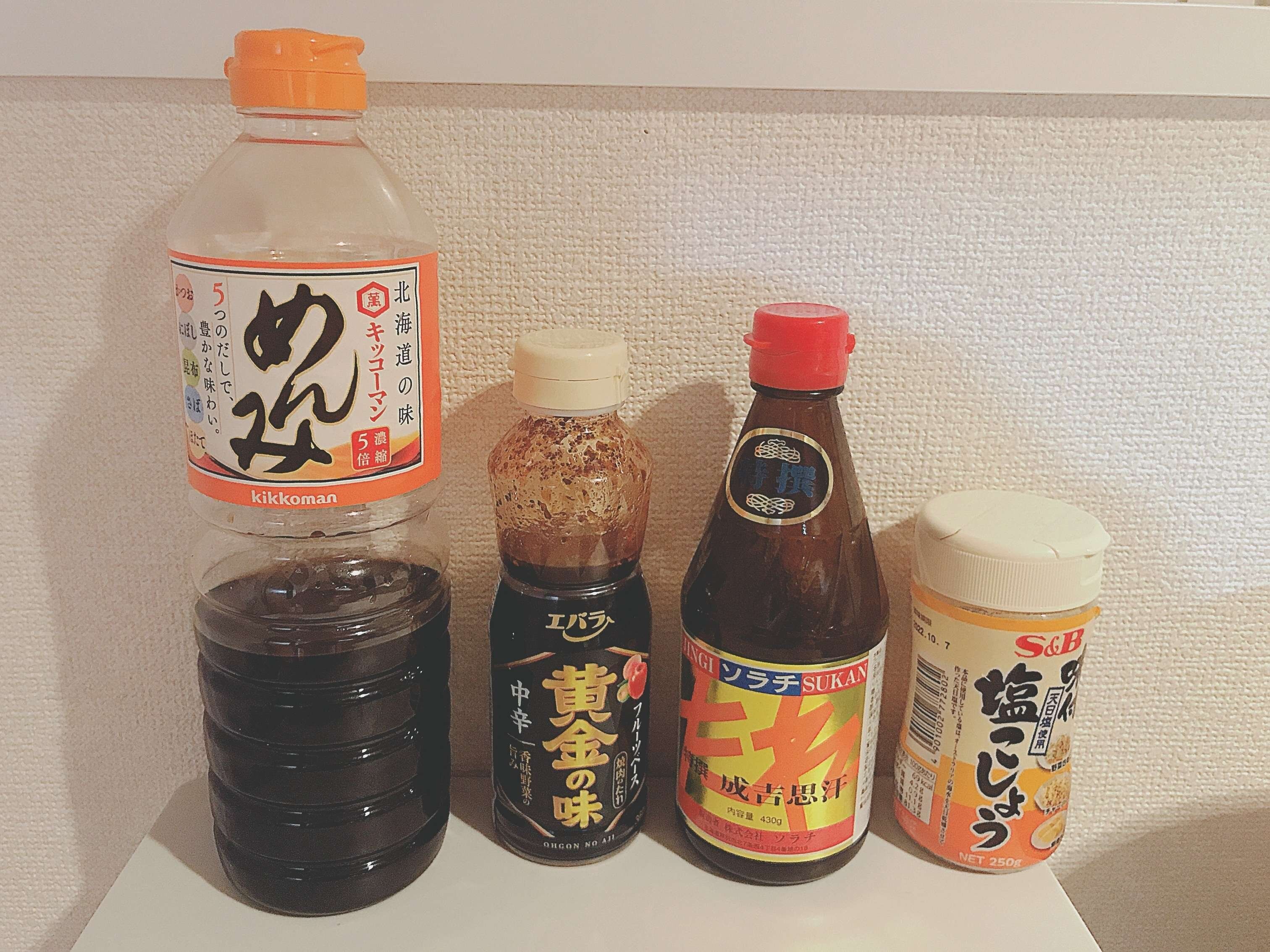 焼き肉のたれ、めんつゆ、塩コショウなど一つで味付けで終わる調味料を使えば、簡単に味付けができて失敗もありません。