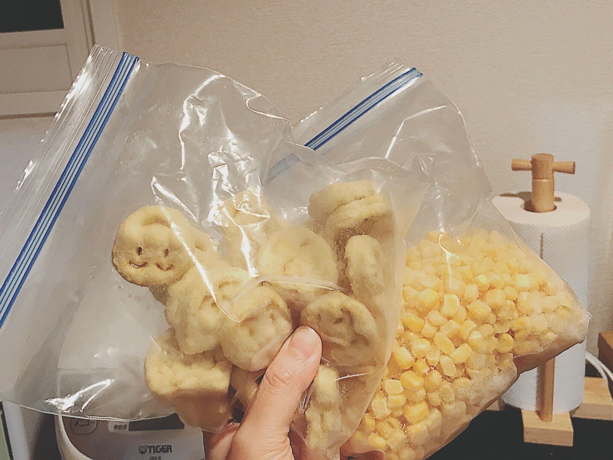 冷凍野菜なども買ってきてすぐにジッパー付き保存袋に入れ替えます。