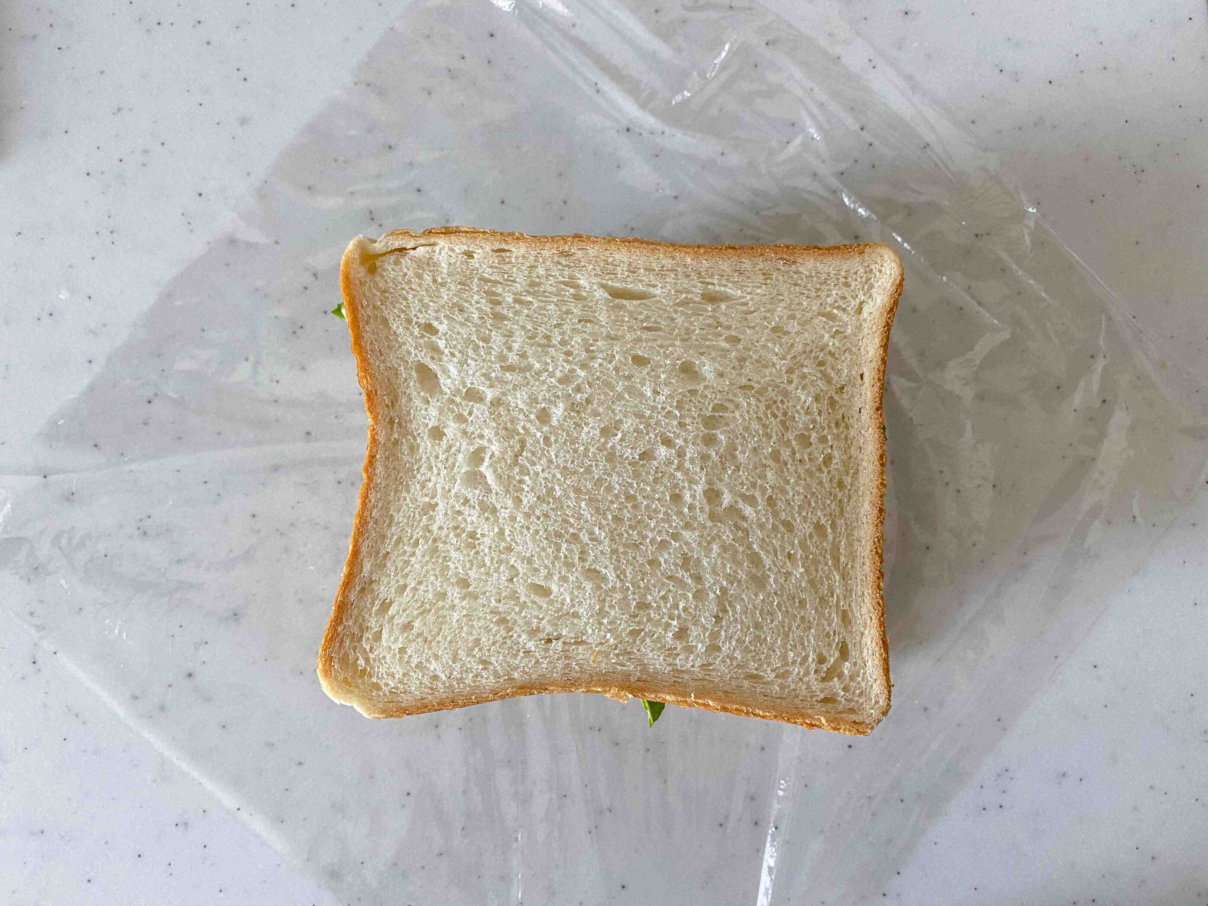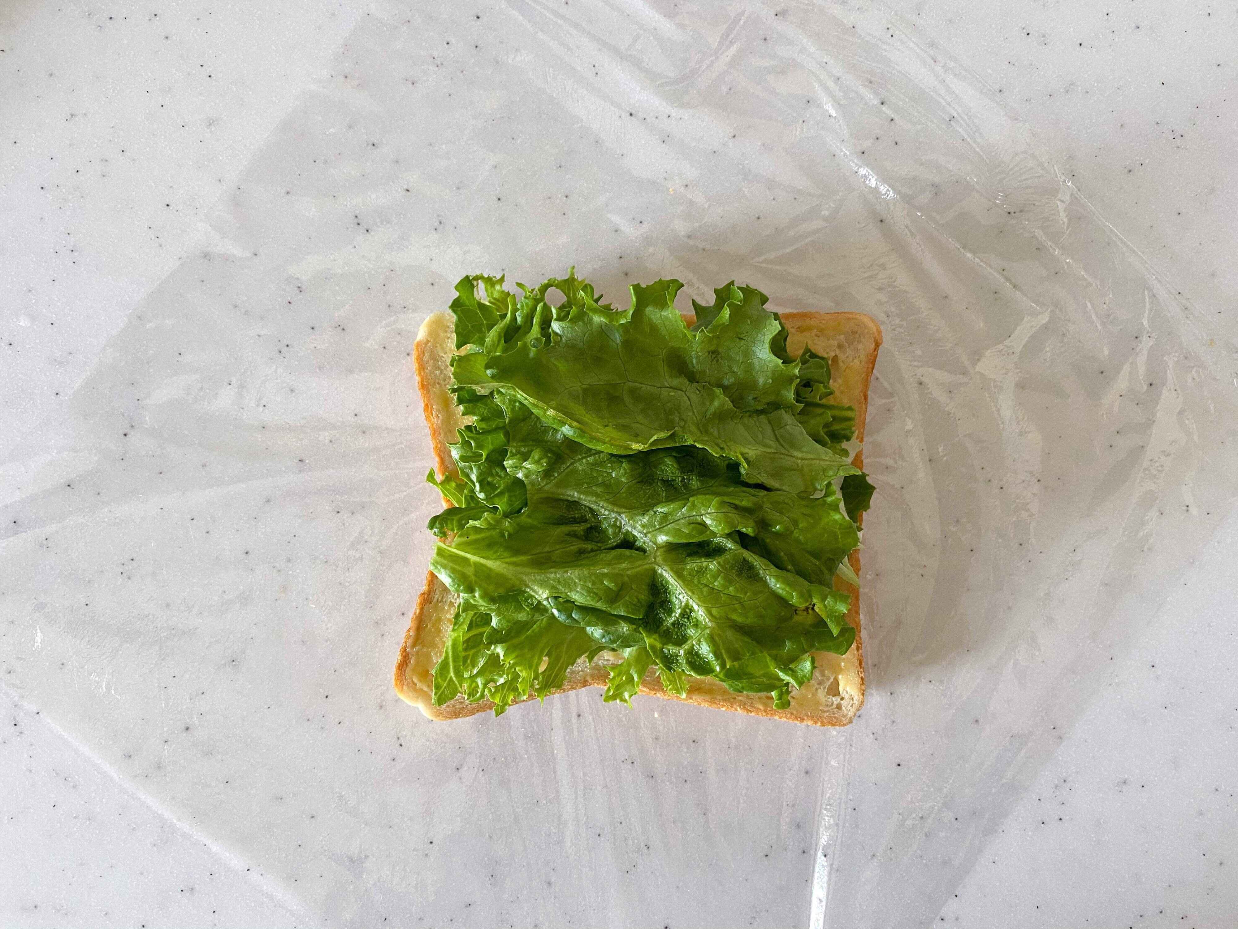 最後に残りのグリーンレタスをのせ、もう一枚の食パンで蓋をする。