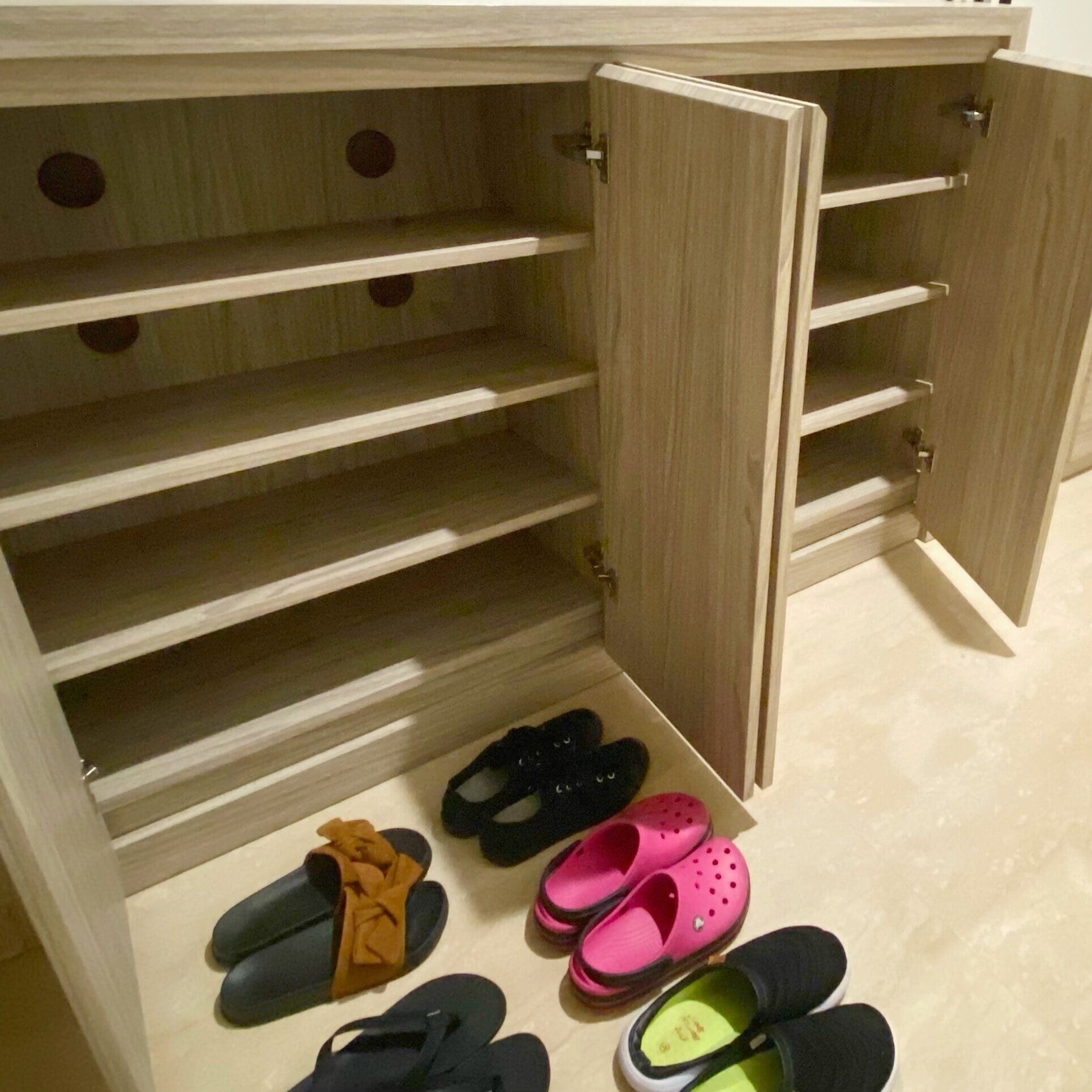 下駄箱を閉めっぱなしにしていると、臭いがこもり悪臭の原因に。1時間程度、下駄箱を開けっぱなしにして換気をしましょう。