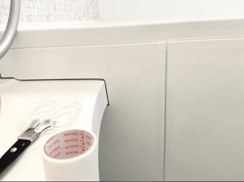 そこで役立つのがダイソーの「カビ汚れ防止マスキングテープ」。床に近いゴムパッキンやエプロンにマスキングテープを貼っておくと、水分が入らないのでカビが発生しません。水やお湯がかかっても取れてくるようなこともなく、意外にも見た目も気にならず、防カビ効果があるので浴室で一番本領を発揮してくれます。