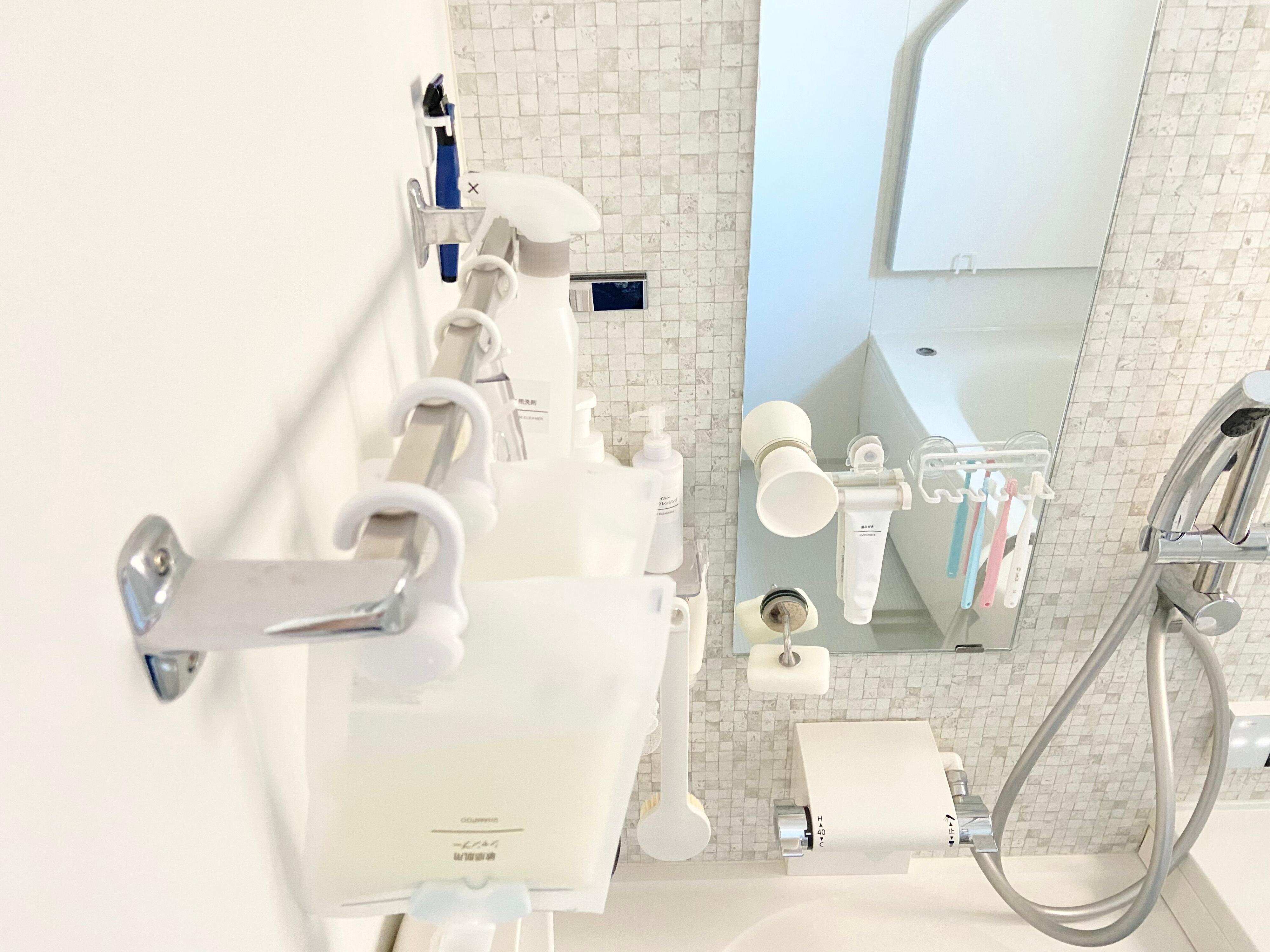 シャンプーやコンディショナーなどのボトル類は気がつくと底面がヌルヌルに。接地面にも汚れが溜まりやすく、カビが発生しやすい状況を作り出してしまうので、基本なんでも浮かす収納にして、面倒な掃除が少しでも楽になるようにしています。