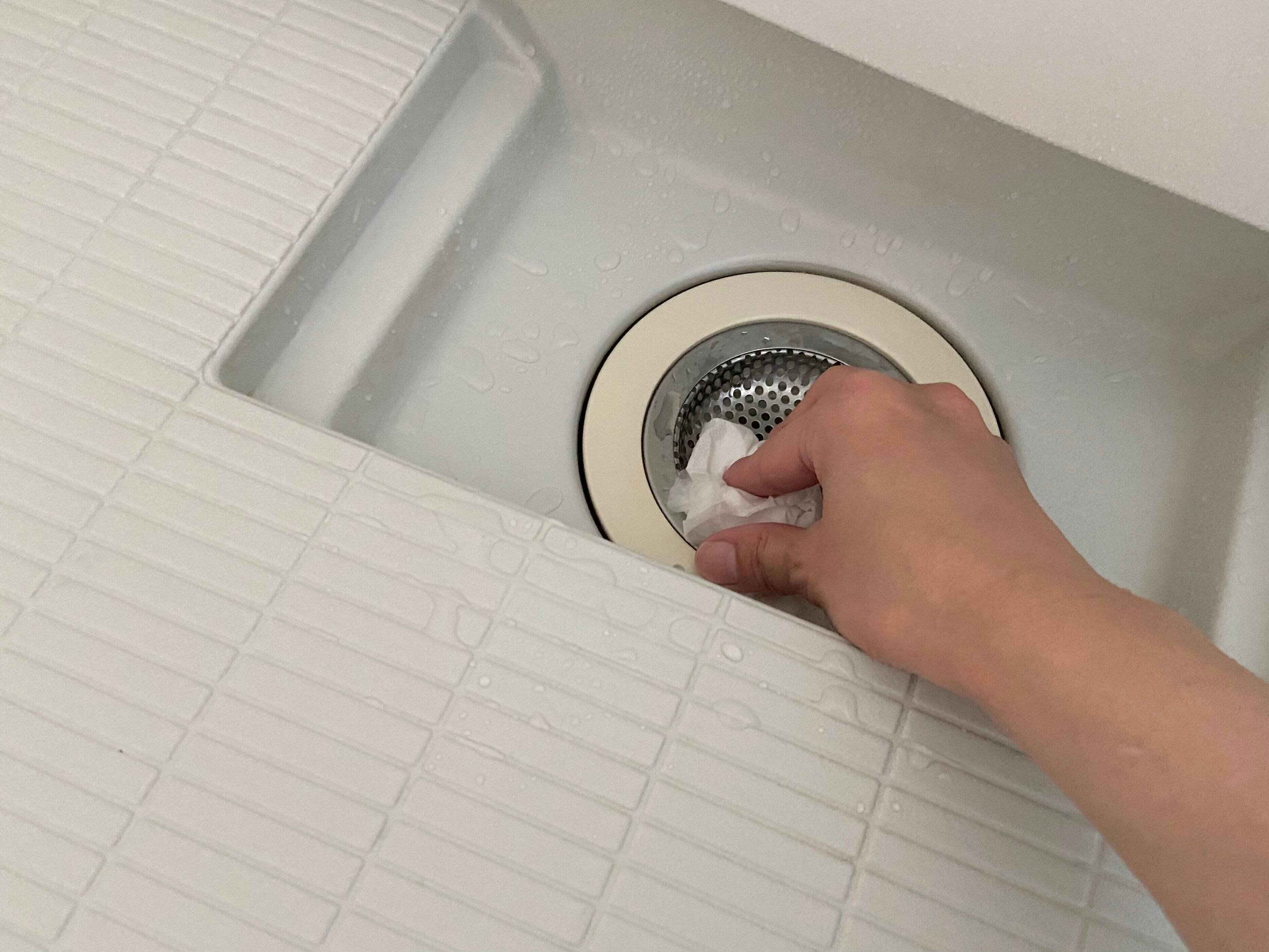 排水口の蓋を外して、髪の毛などのゴミを毎日ティッシュで取り除くようにしています。