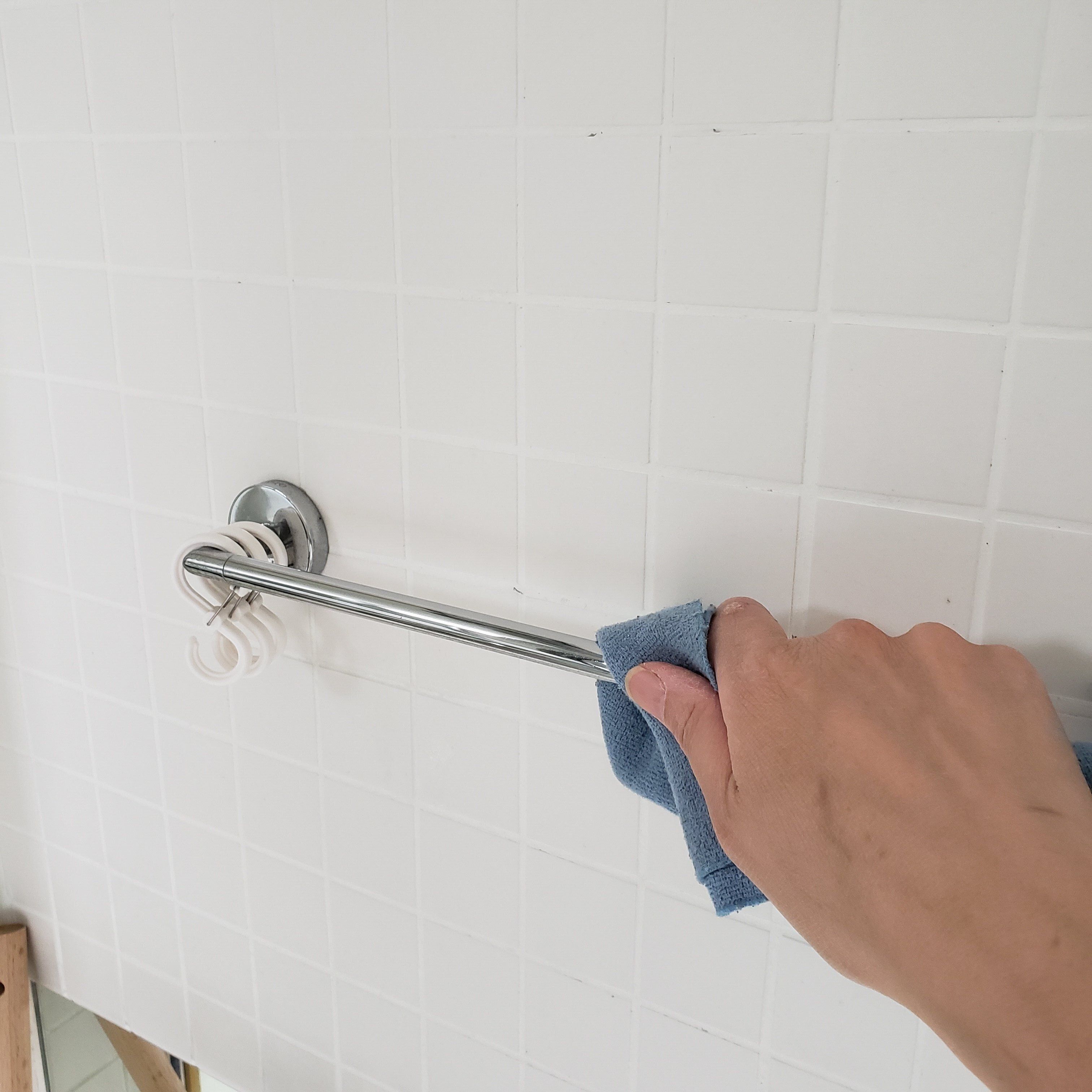 タオルバーや小物もカビ防止しておきたいので、同じようにパストリーゼで拭きます。面倒ではありますが、ひとつひとつ手で丁寧に拭きます。