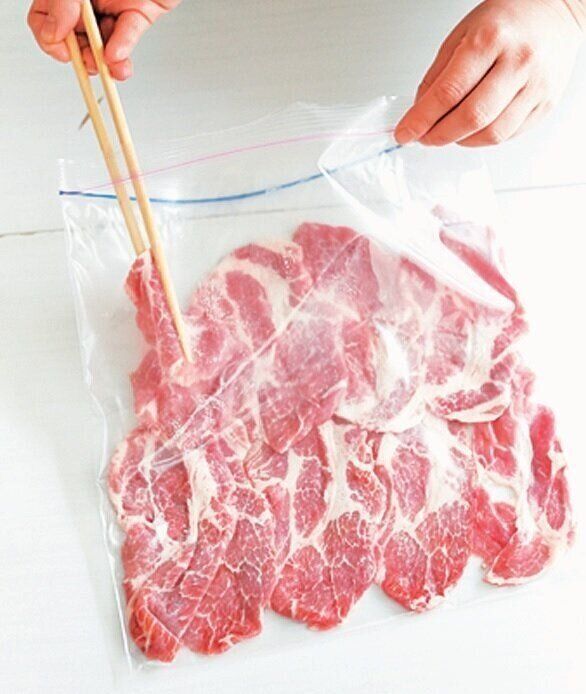 薄切り肉はくっつきやすいので、袋の中に広げるように入れて調味液を加える。