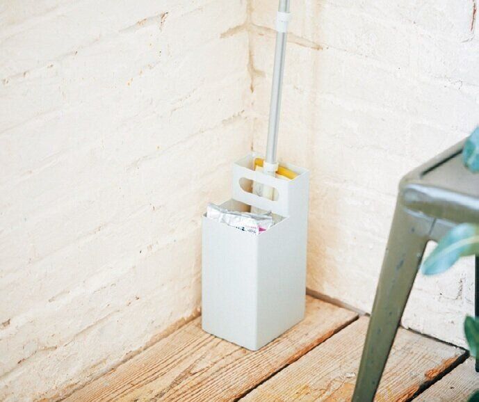 フローリングワイパーと除菌シートをまとめてコンパクトに収納。約1.06kgと重めなので倒れにくい。(幅10.9×奥行き13×高さ26cm)