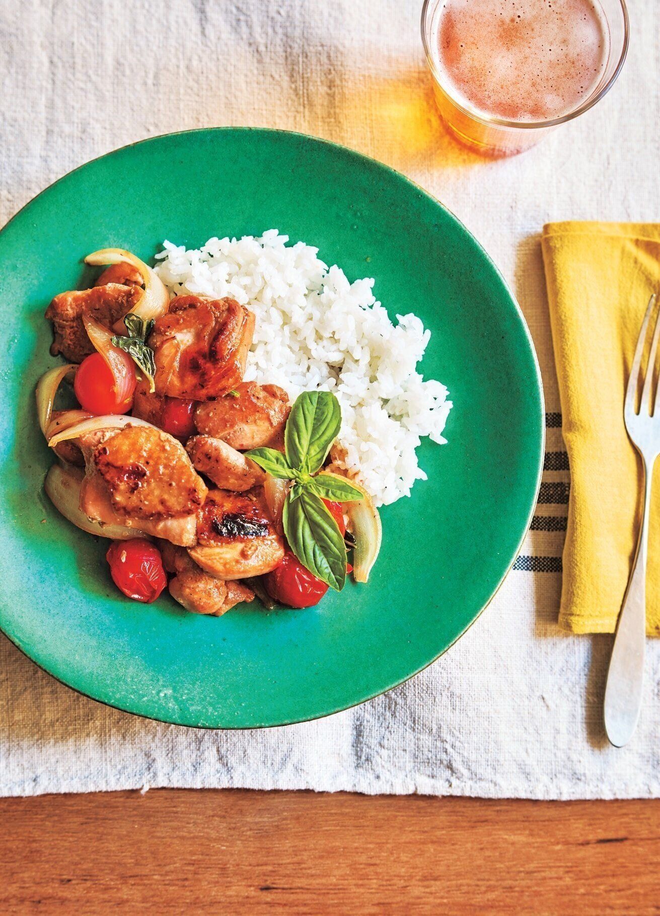 (3)バジルをちぎって炒め合わせ、火を止めて粗びき黒こしょうをふる。ご飯と一緒に器に盛る。