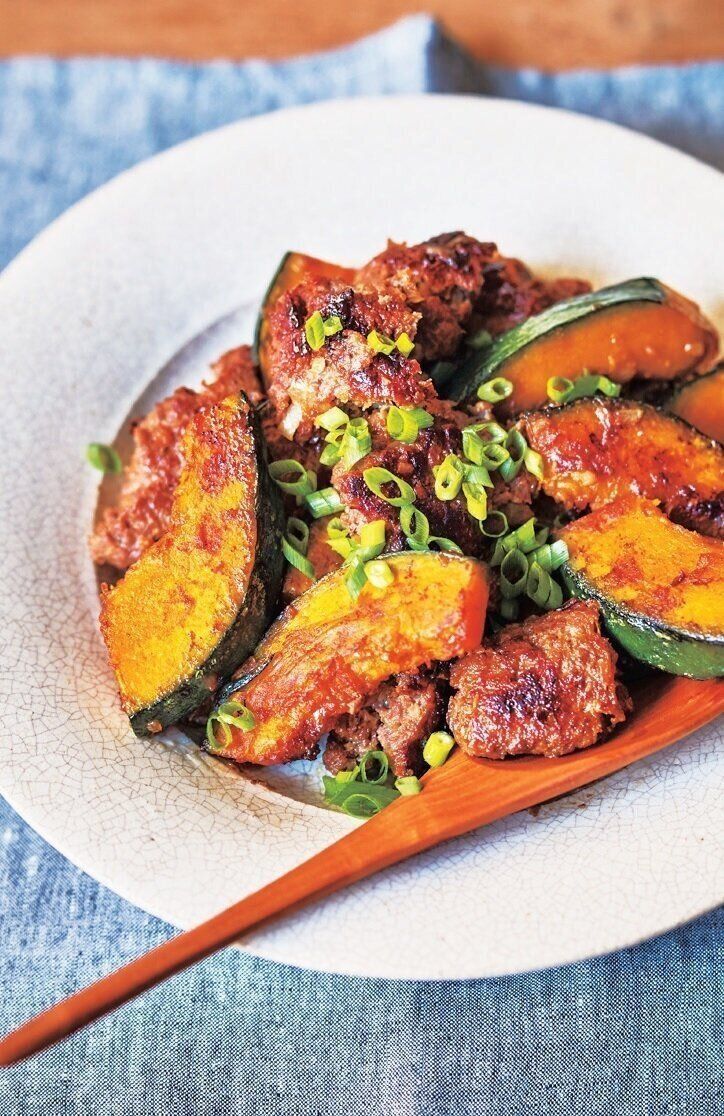 (2)フライパンにひき肉を凍ったまま4等分にして入れ、かぼちゃを並べる。ふたをして弱火にかけ、4~5分蒸し焼きにする。焼き色がついたら裏返し、ひき肉を木べらで粗くほぐす。ざっくりと炒め合わせて器に盛り、万能ねぎを散らす。