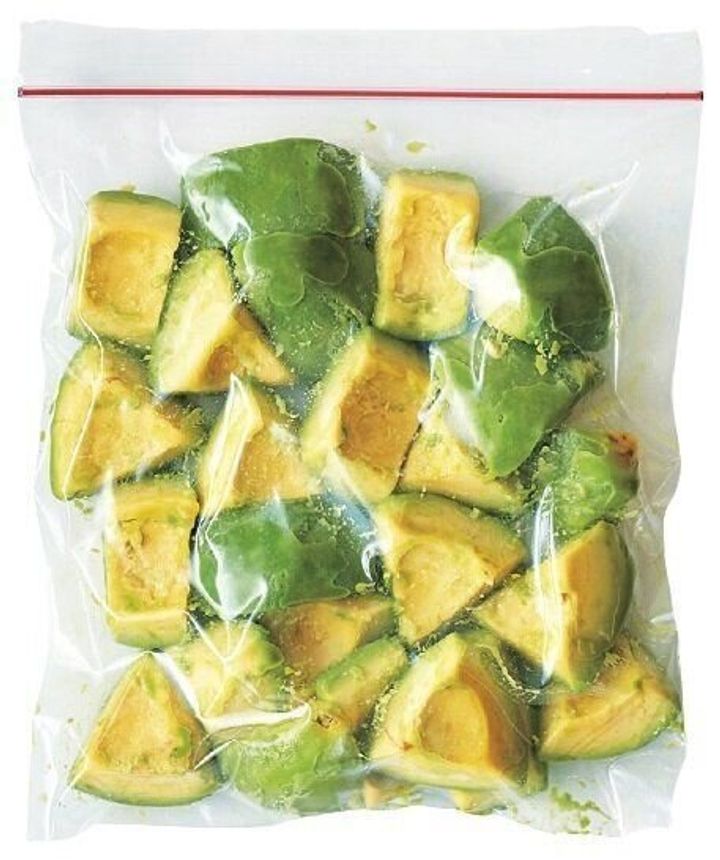 レモンの絞り汁を全体にふってから冷凍。熟した物は袋を密閉するときに形がくずれがちなので、硬めの物がおすすめ。