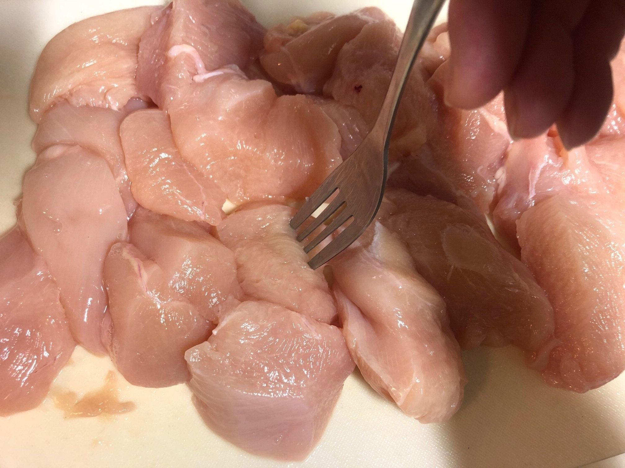 鶏むね肉を料理に合わせたサイズに切り分け、フォークでブスブスと刺し繊維を壊しておく。(今日は唐揚げ用に4~5センチ四方サイズです)
