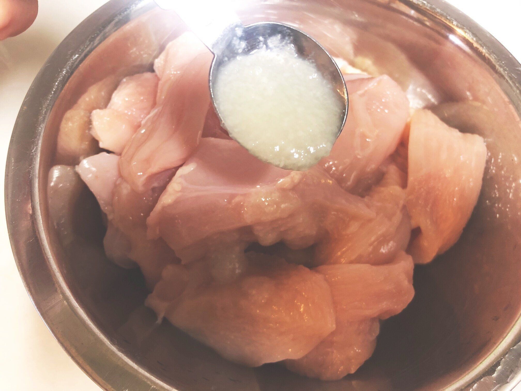 塩麹と水を加えた鶏むね肉に、しょうゆ大さじ2と、ニンニクと生姜のチューブを3センチくらい入れ、肉に下味を付ける。(少し薄味なので、ご家庭で好きな味付けに加減してください)