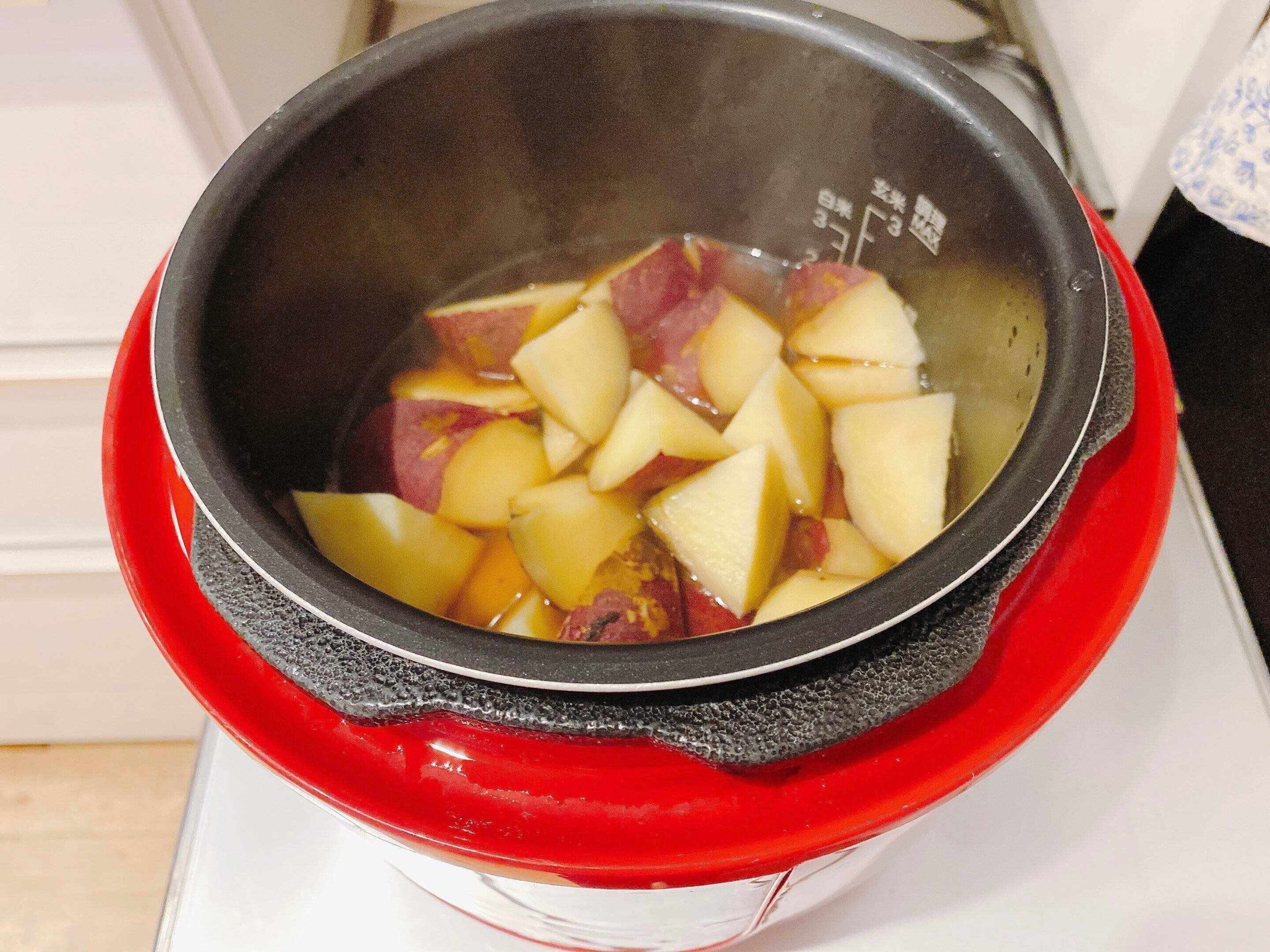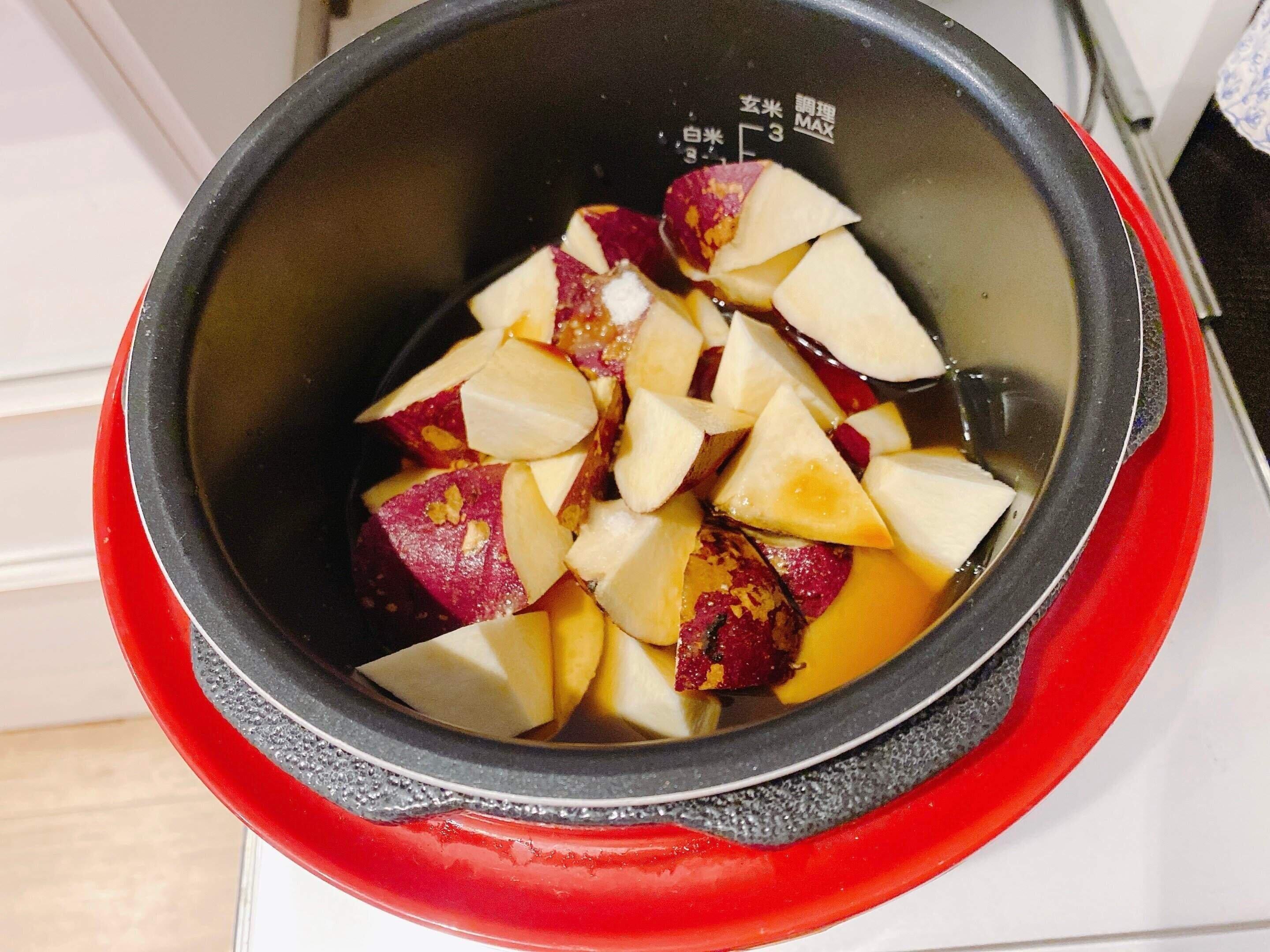 2.内なべに1のさつまいもと醤油と砂糖、水を入れる。