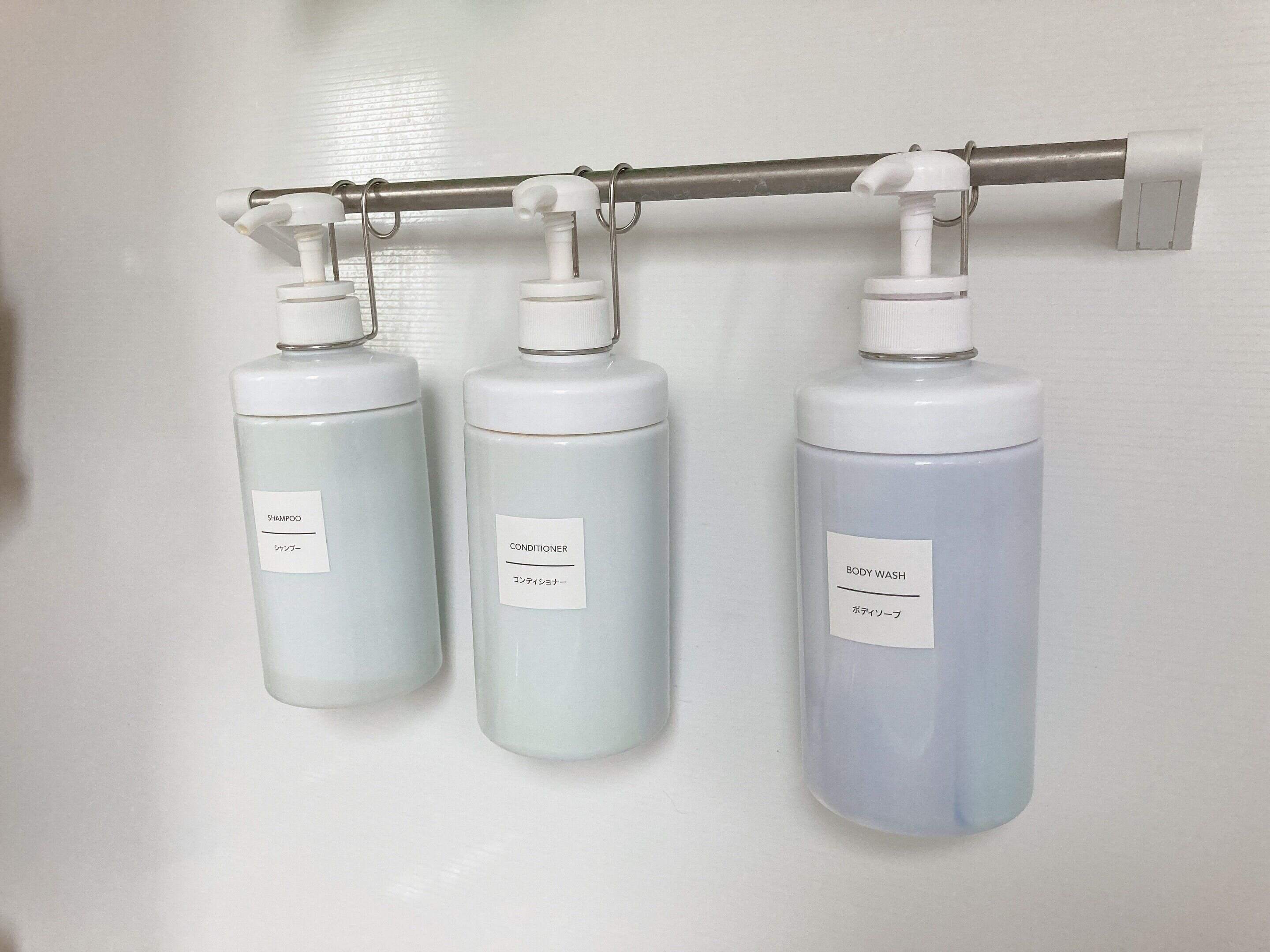 定番の「吊り下げ収納」でボトルの底のヌメヌメ防止をしています。