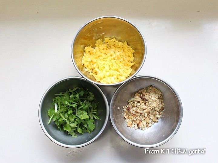 (1)炒り卵を作り、アーモンド(ミックスナッツ)を砕いておく。