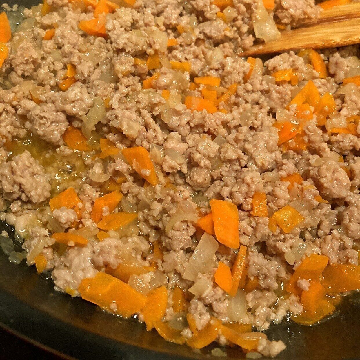 豚ひき肉の油が溶けだしてくるので油はほとんど加えませんが、オリーブオイルを少し足すのも良いと思います。