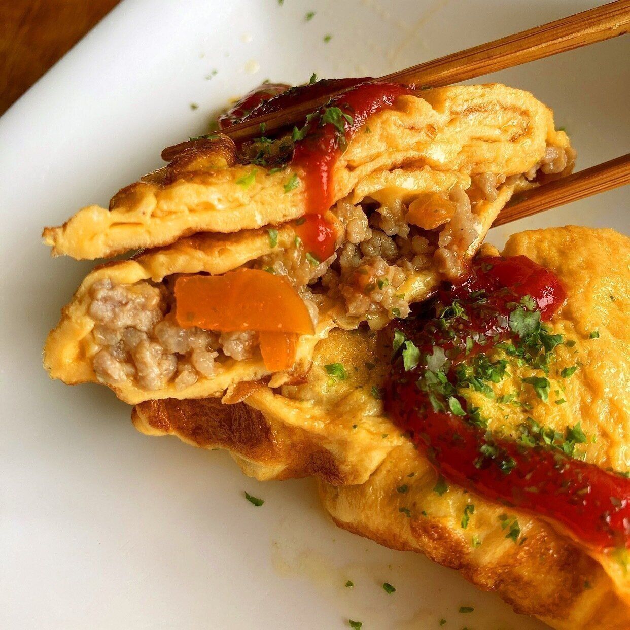 野菜入り豚ひき肉そぼろを具材に作ったオムレツです。