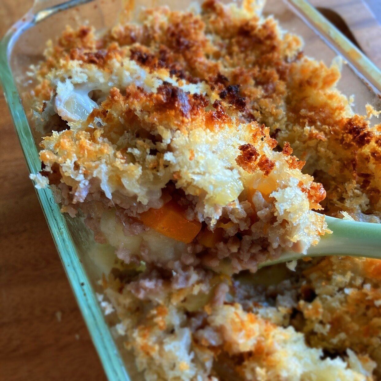 耐熱容器にマッシュポテト、その上に「野菜入り豚ひき肉そぼろ」をのせ、ピザ用チーズをまんべんなく広げます。またその上にパン粉に粉チーズと油を少々混ぜ合わせたものを重ねます。