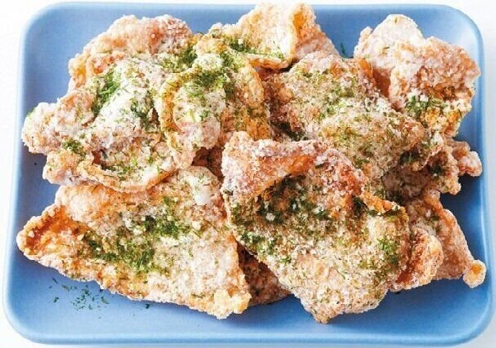 (2)フライパンに深さ1cmの揚げ油を中温(170℃)に熱し、(1)の肉の半量を広げて淹れ、2~3分、こんがり揚げる。残りの半量も同様に揚げ、青のりをまぶす。