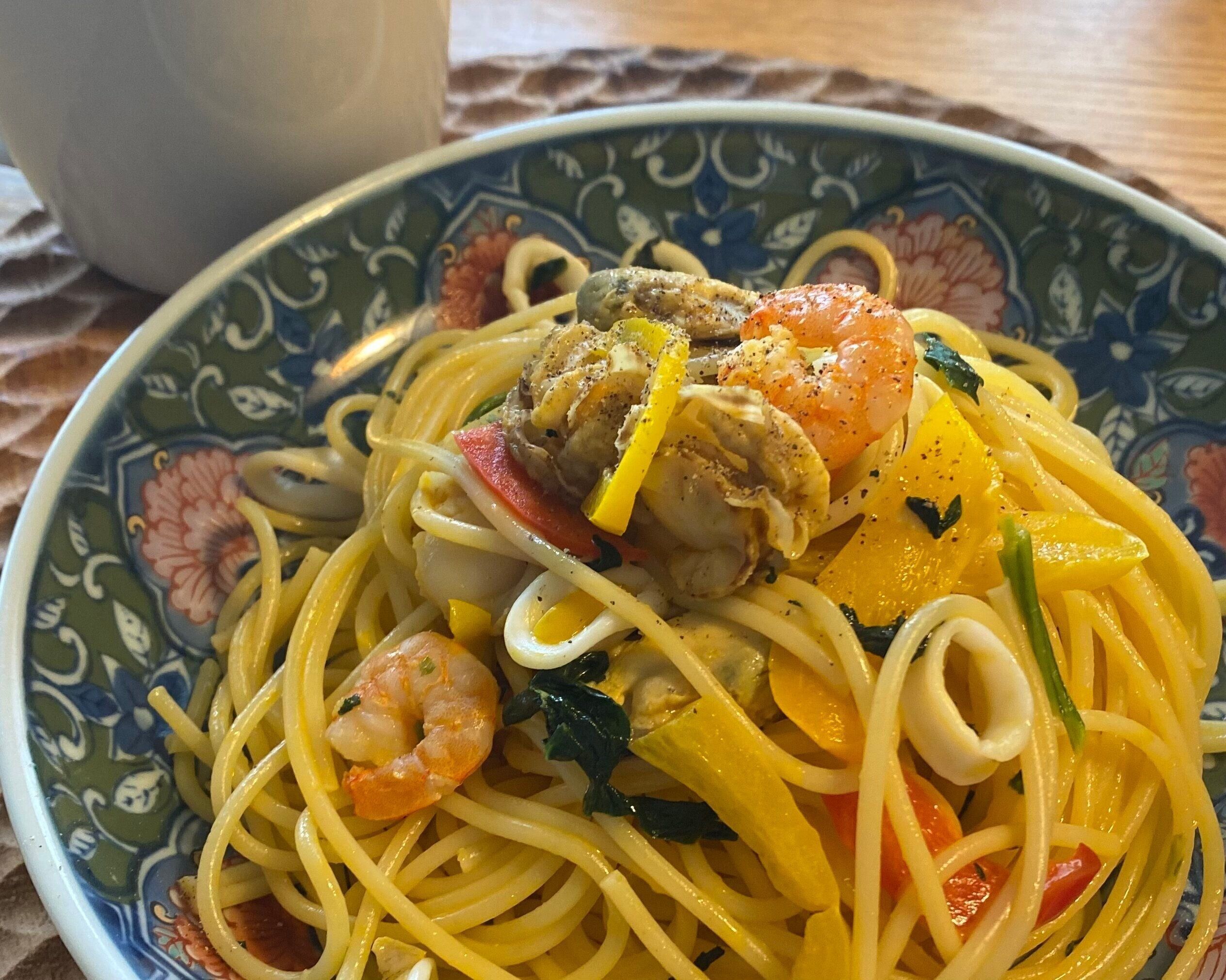 茹でたパスタと具に、バターを和えるだけの簡単調理。